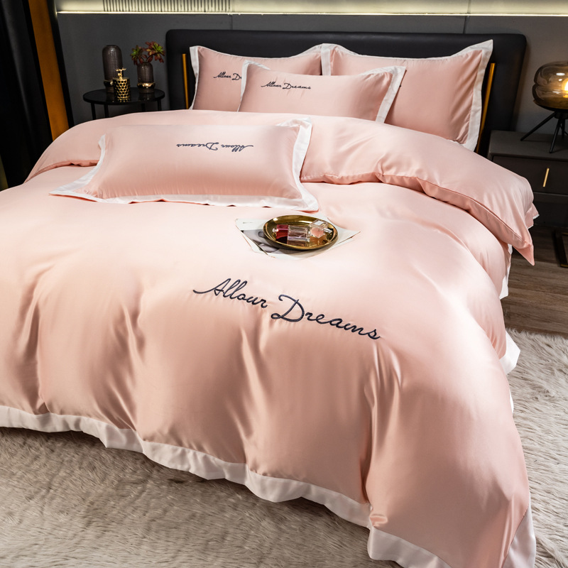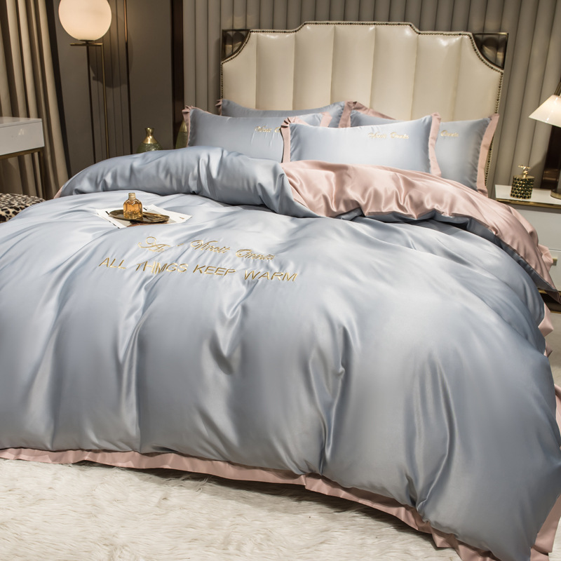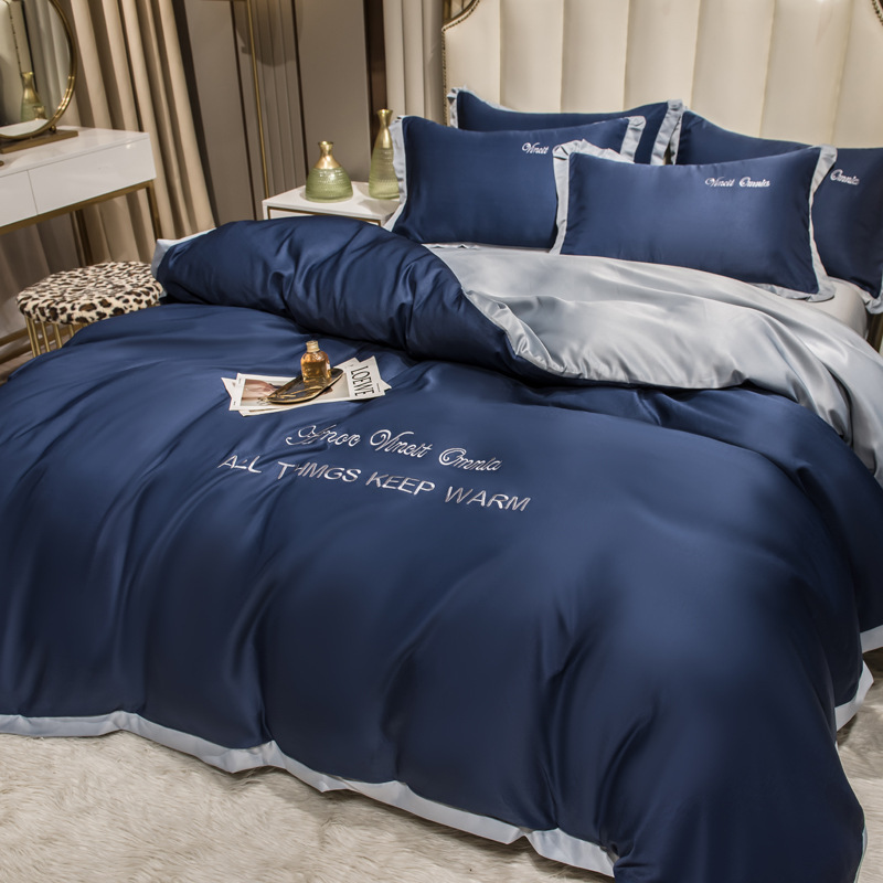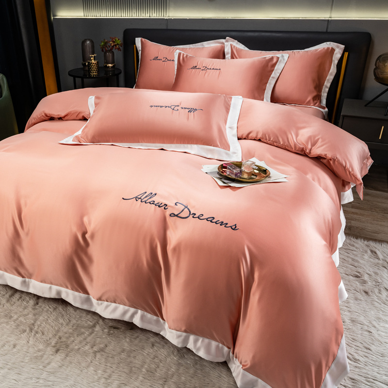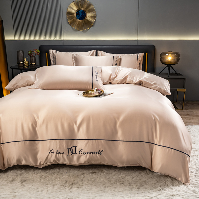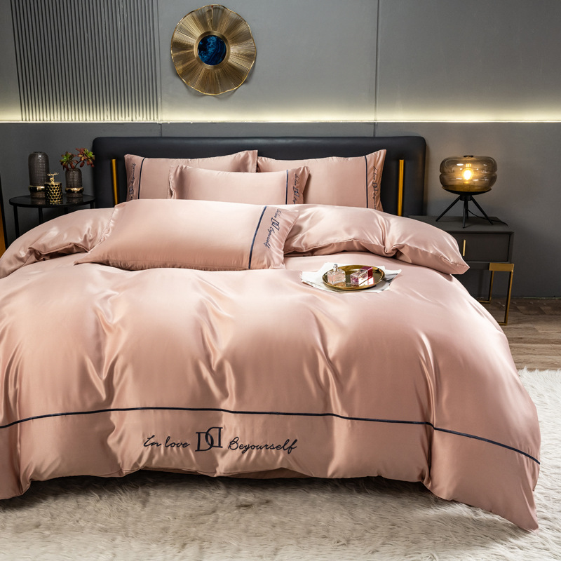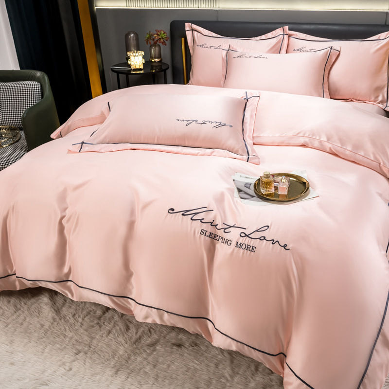 欧式水洗真丝四件套纯色刺绣冰丝被套床上用品床单床笠三件套代发