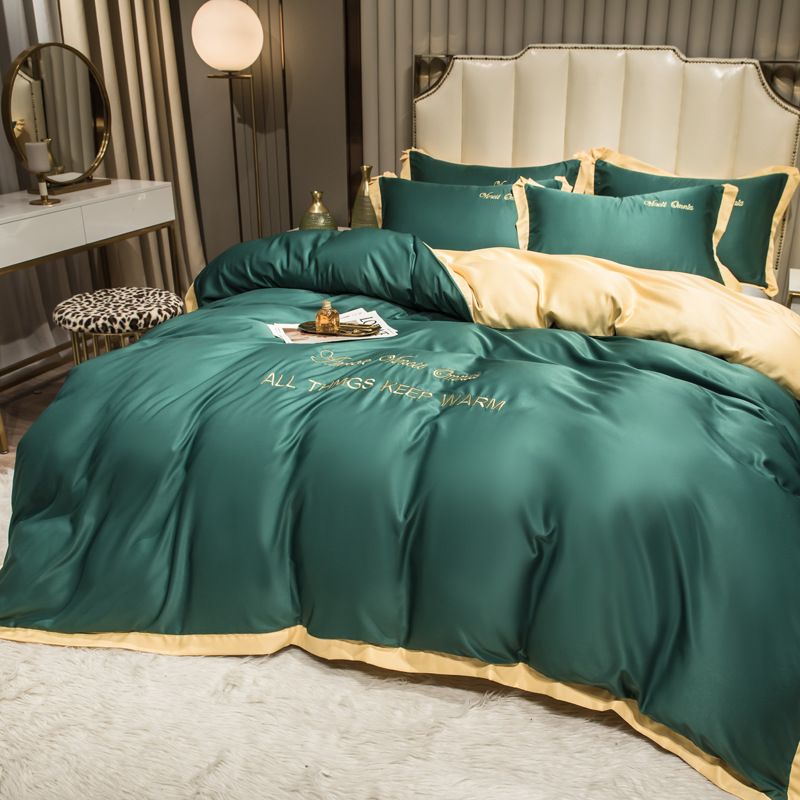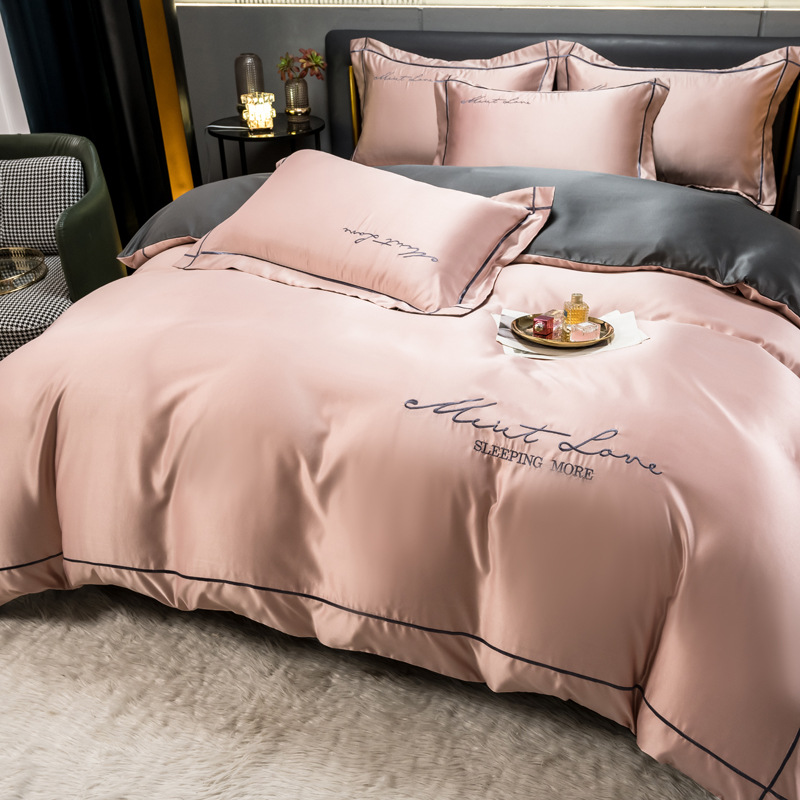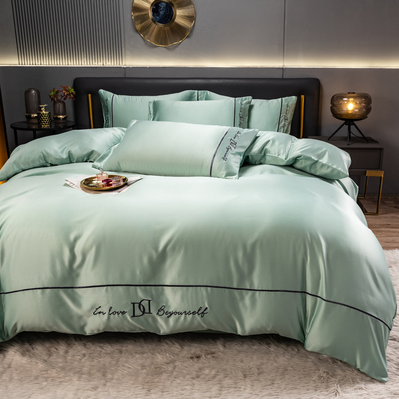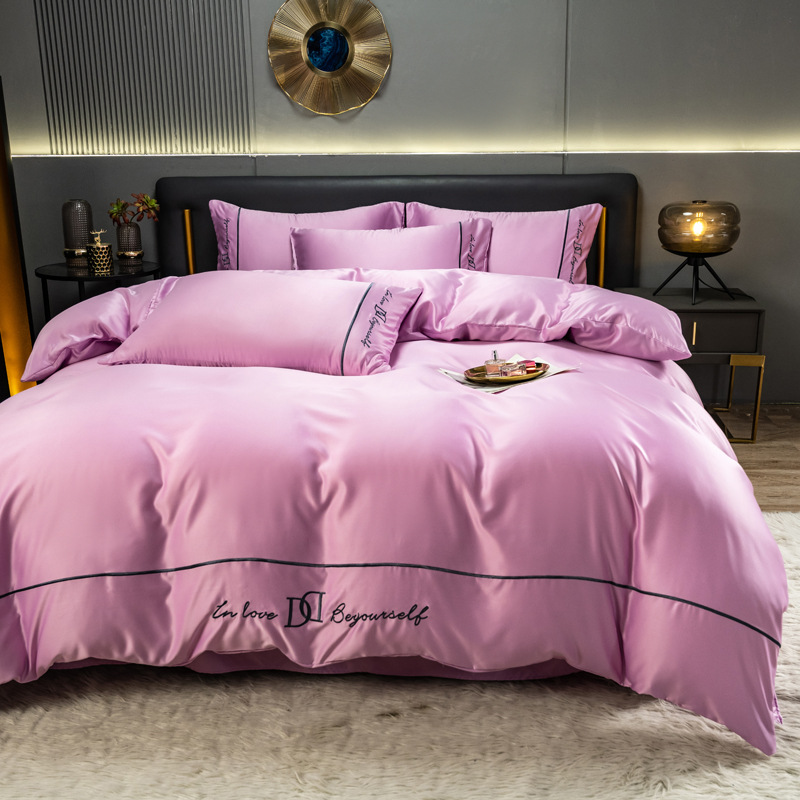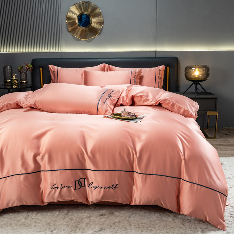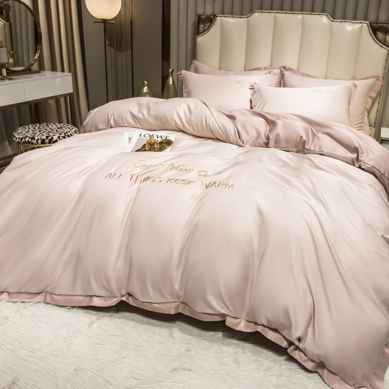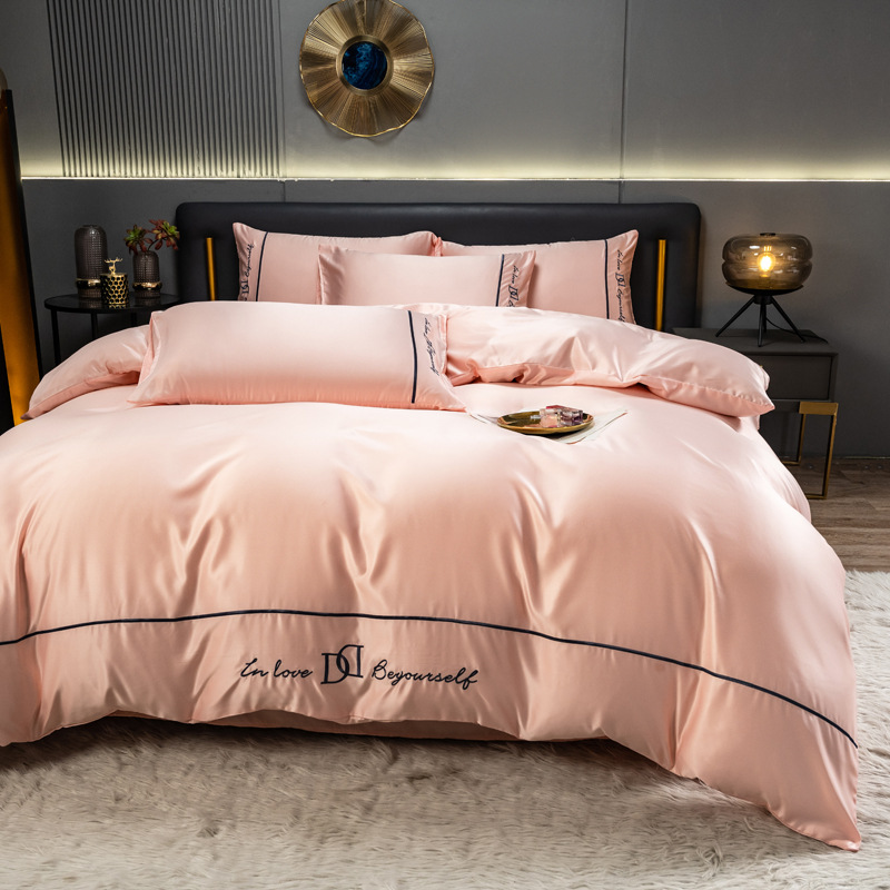 欧式水洗真丝四件套纯色刺绣冰丝被套床上用品床单床笠三件套代发