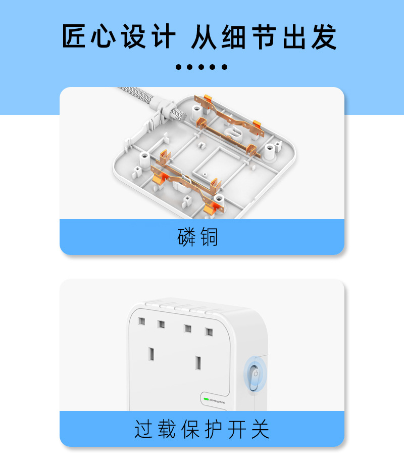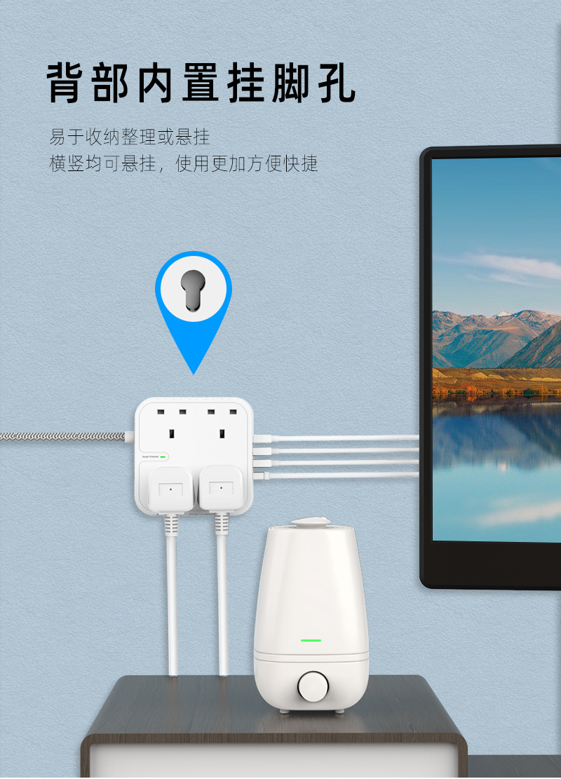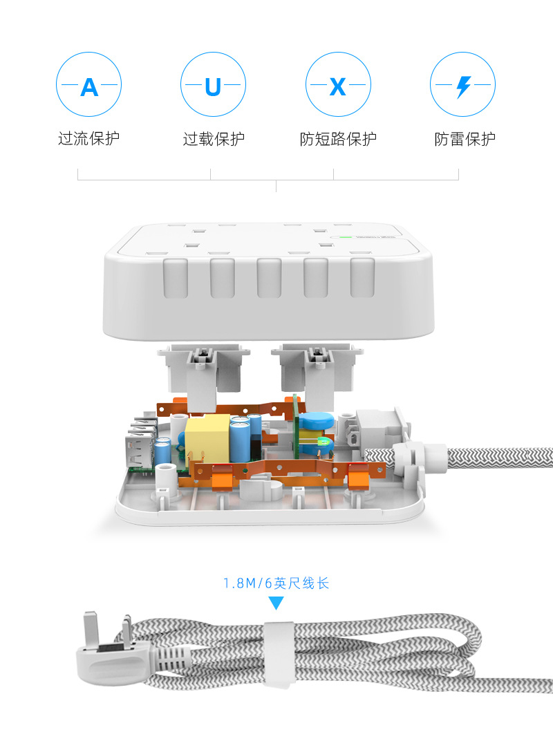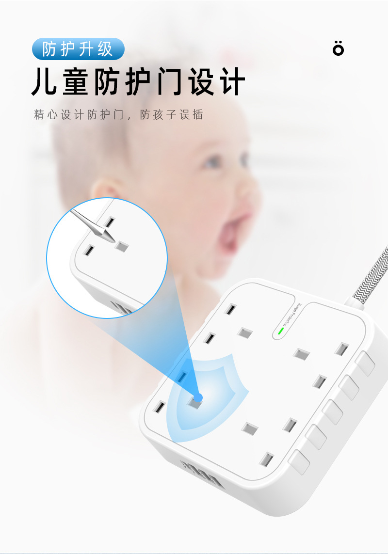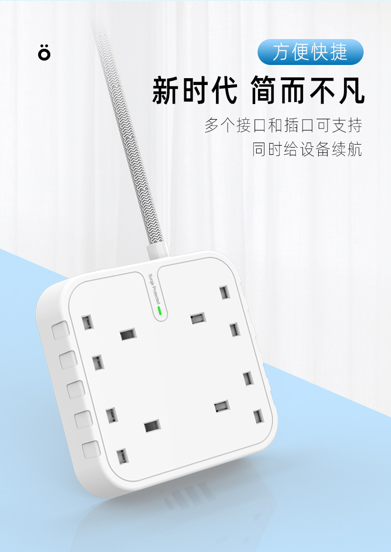 工厂直供新款家用1.8M拖线板英规4孔排插3A+1C防浪涌保护插排插板