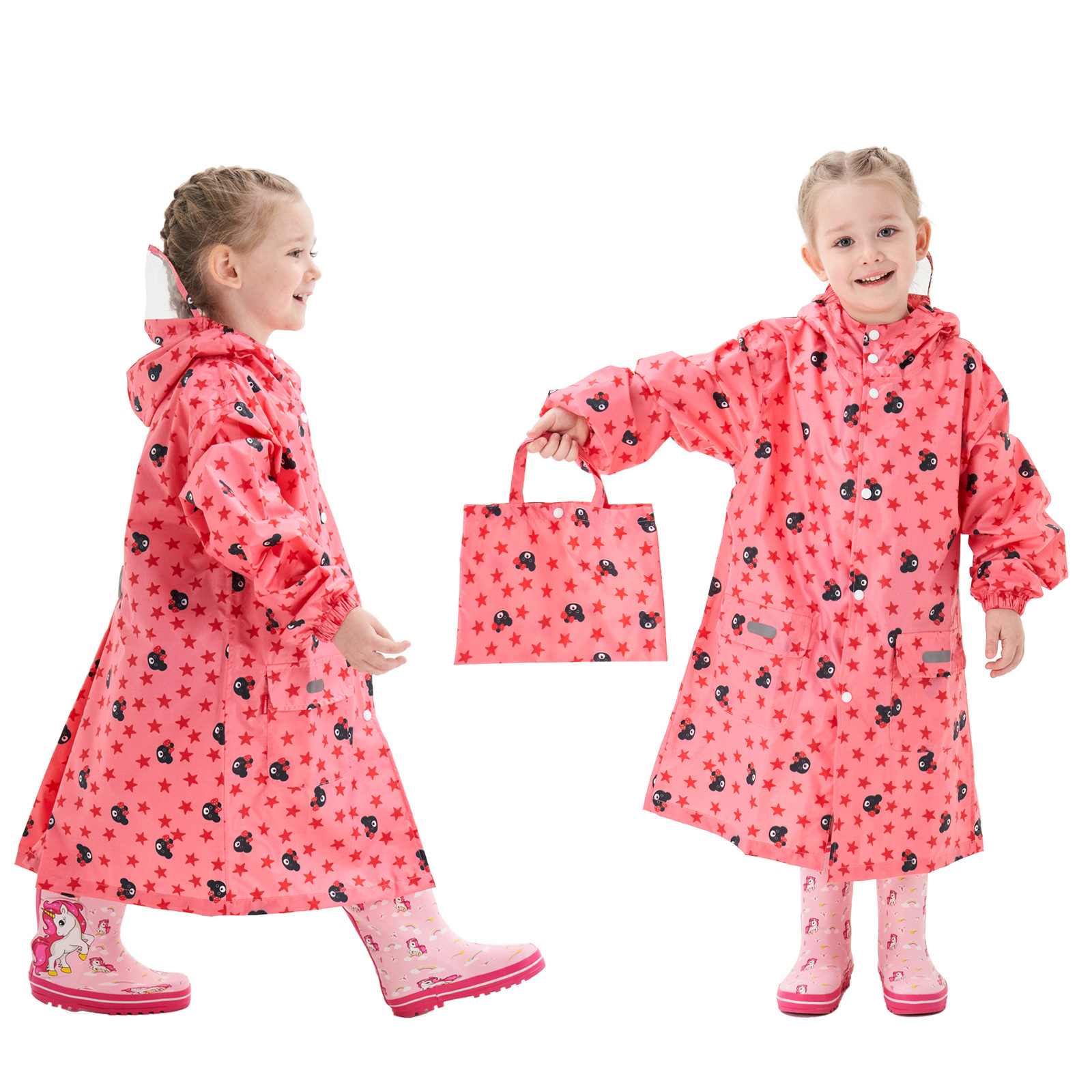 (有书包位,收纳袋,半透明帽子,安全反光条,轻便春亚纺材质)