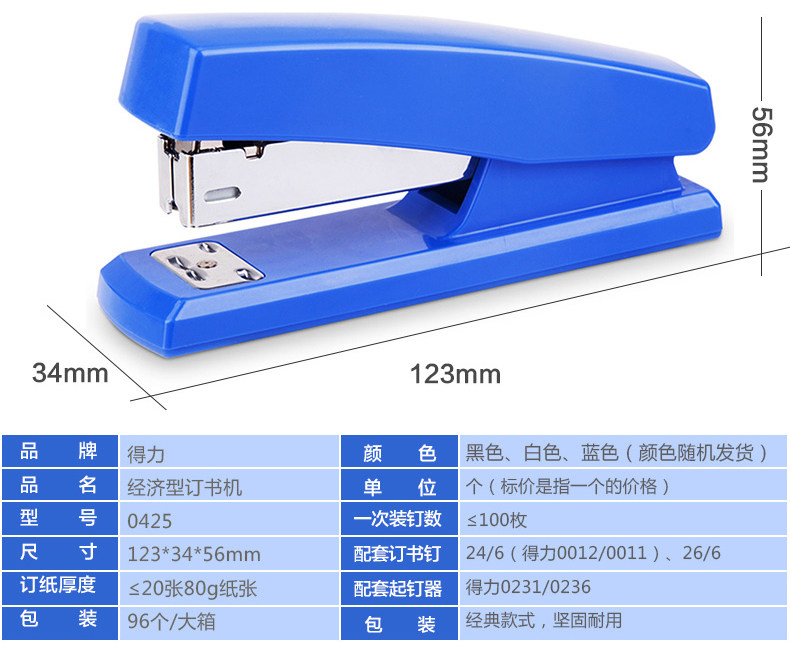 得力0425订书机12号针财务装订机办公用品学生文具可钉20页纸得力