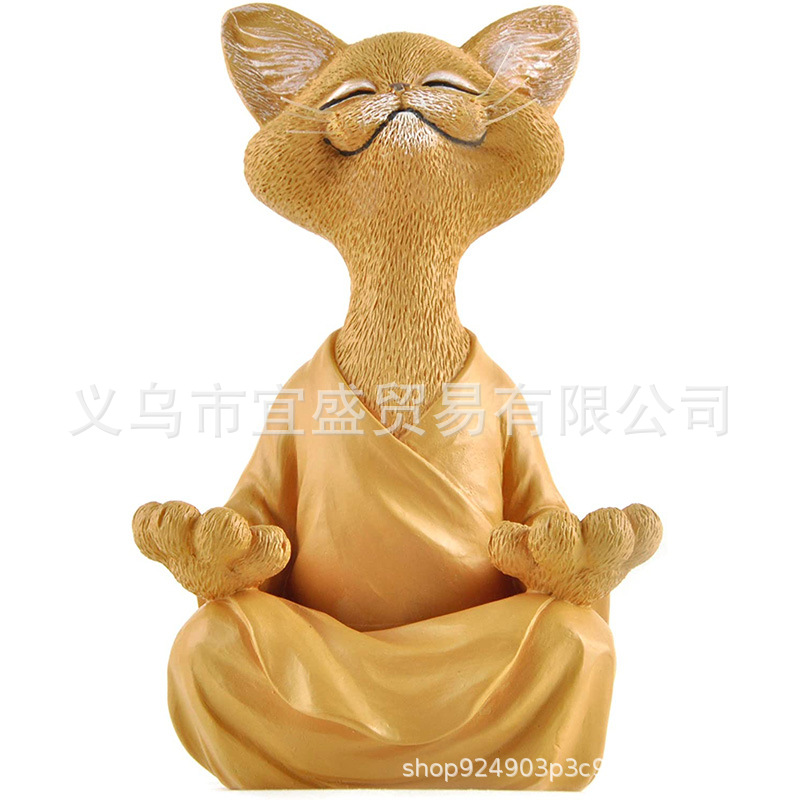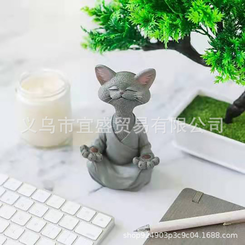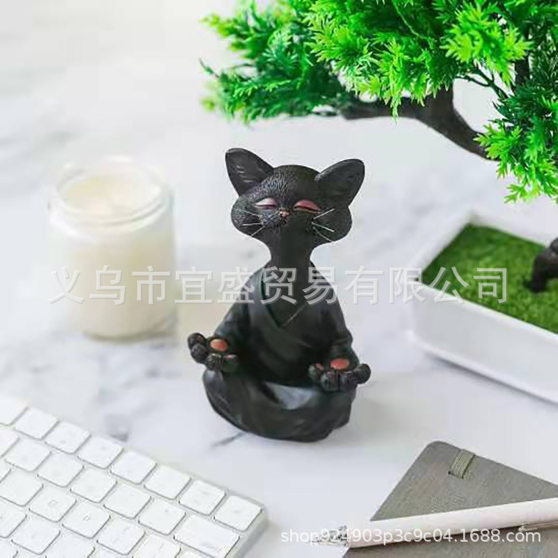 跨境新款 坐禅猫黑色橘色灰色三色打坐胡须猫树脂摆件 庭院设计