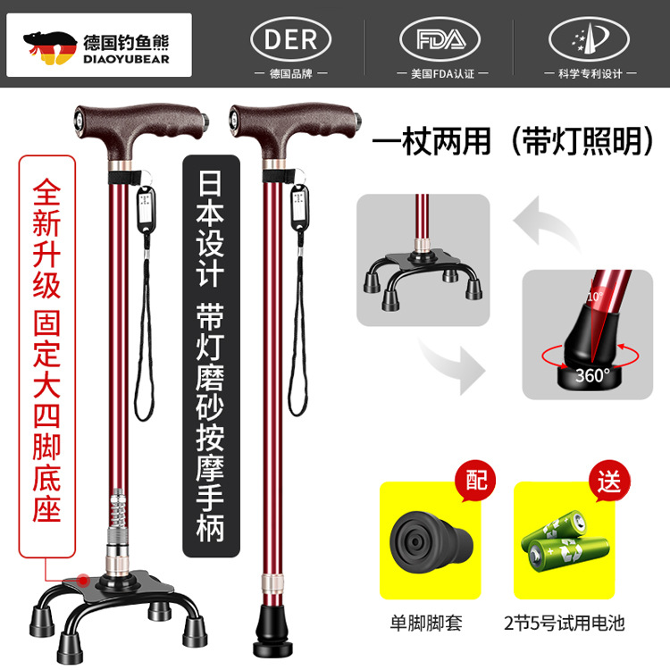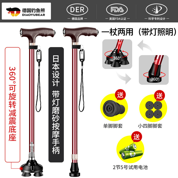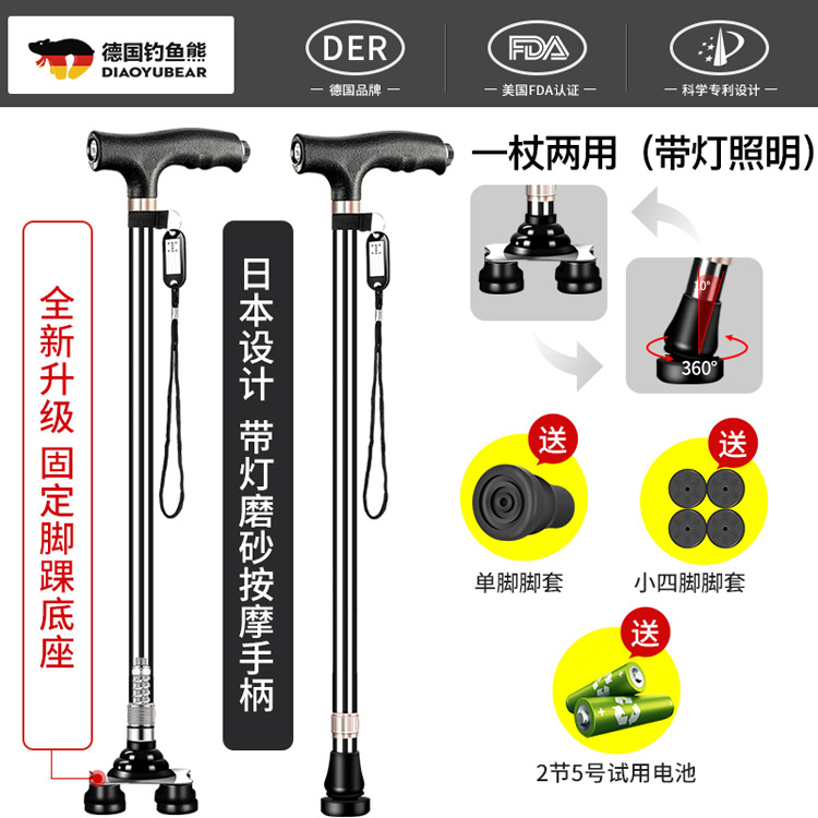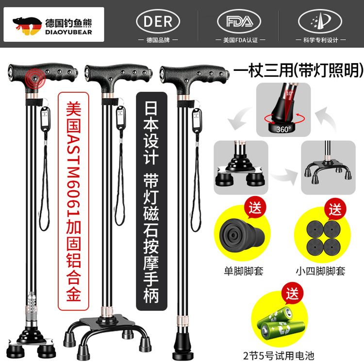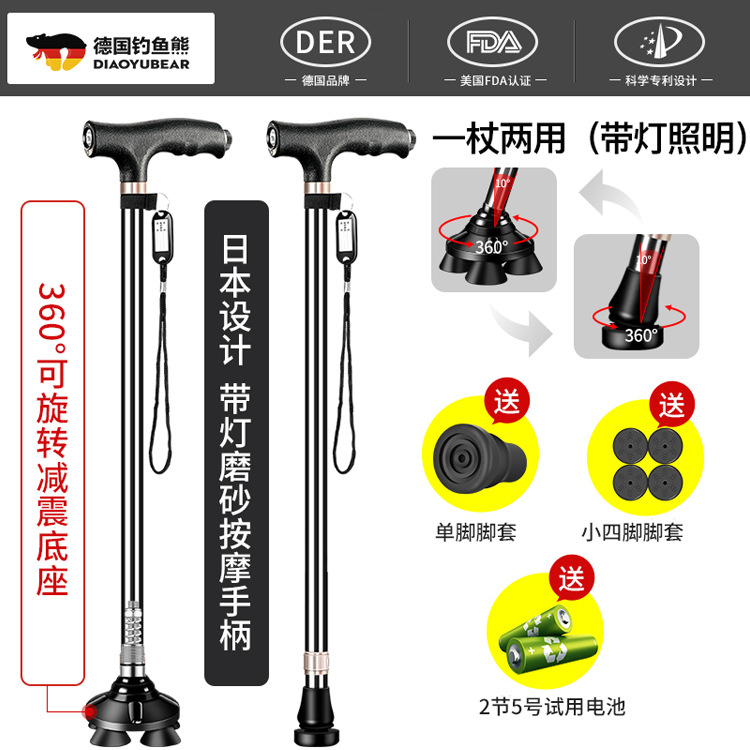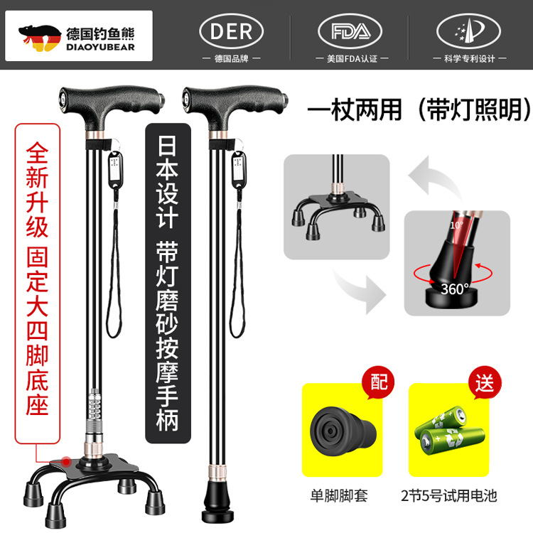 钓鱼熊老人拐杖四脚伸缩手杖老年人扙铝合金轻便多功能灯防滑拐棍