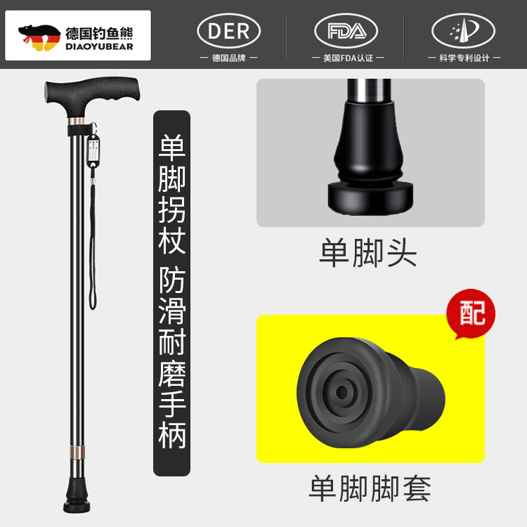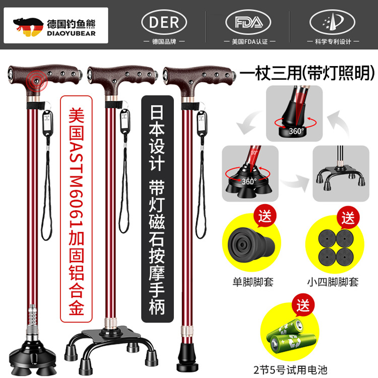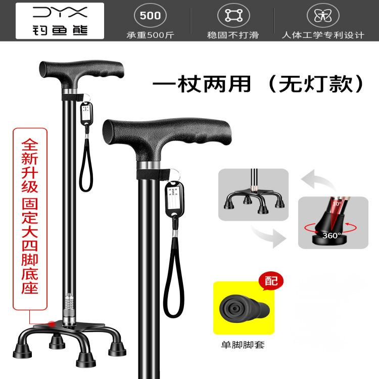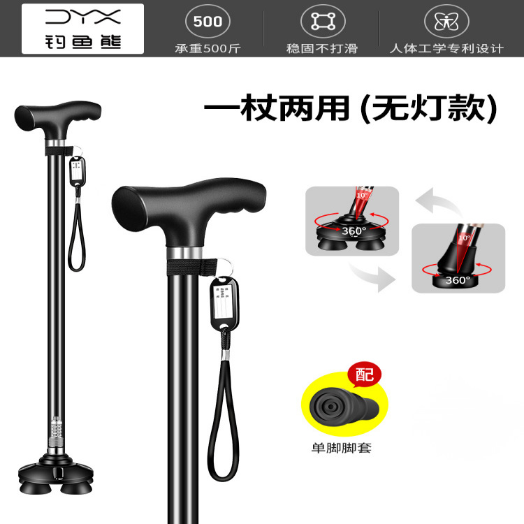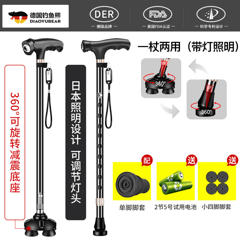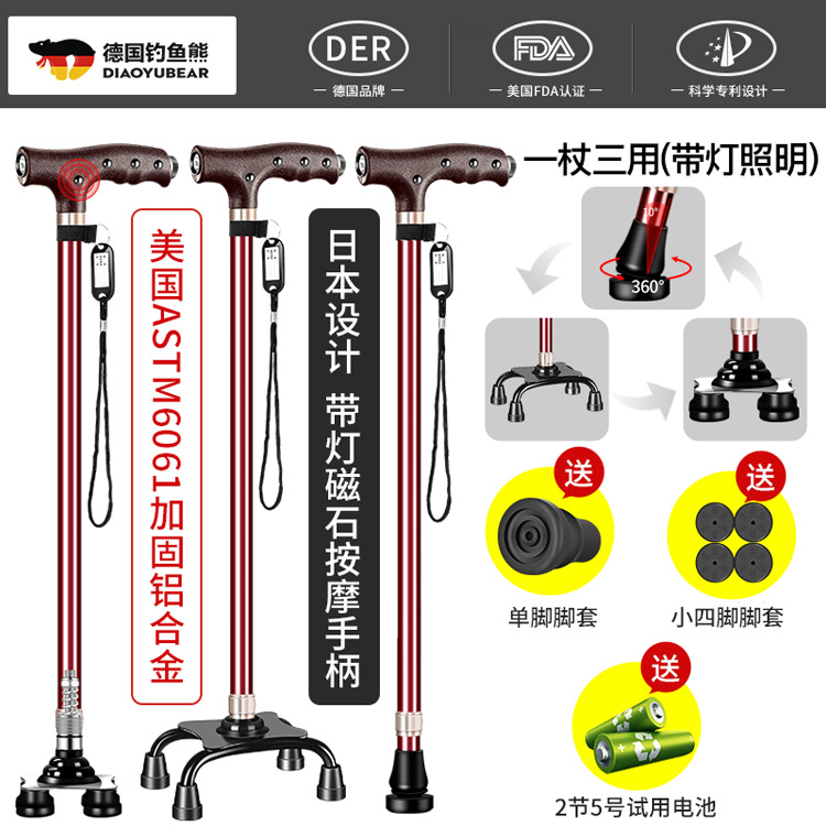钓鱼熊老人拐杖四脚伸缩手杖老年人扙铝合金轻便多功能灯防滑拐棍