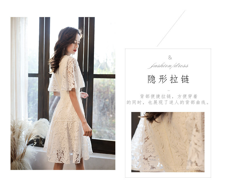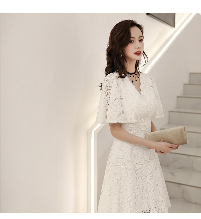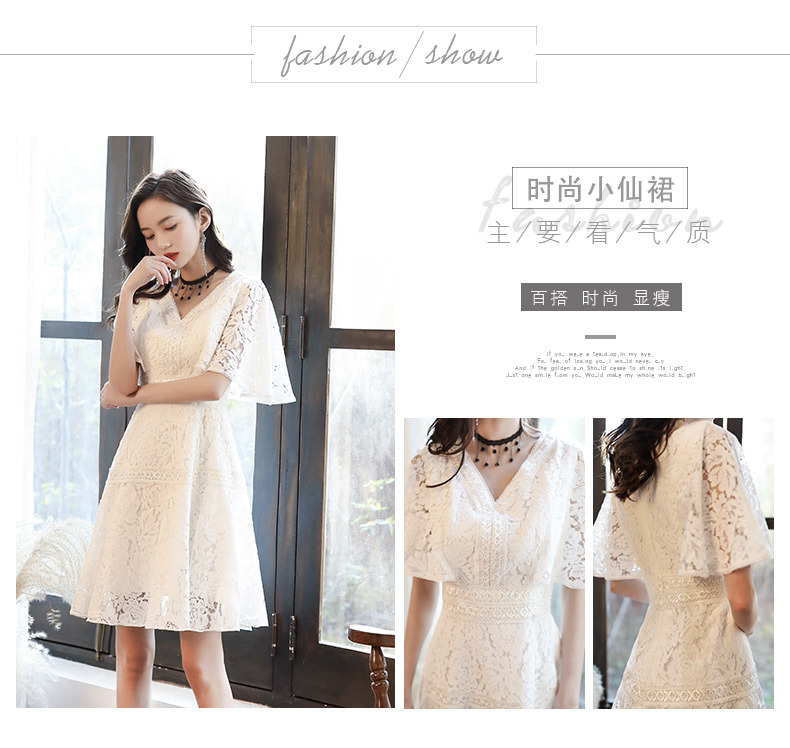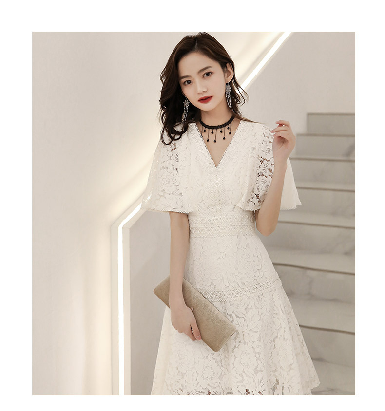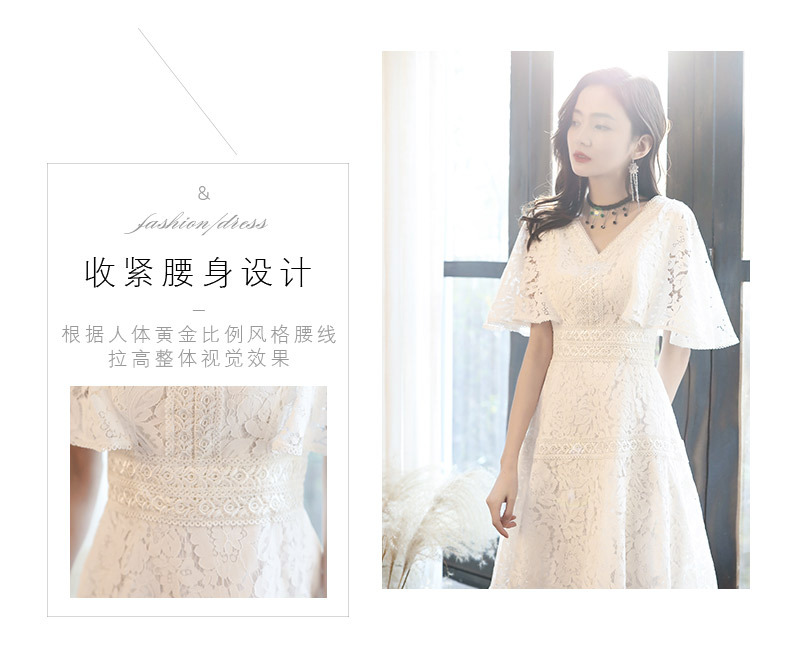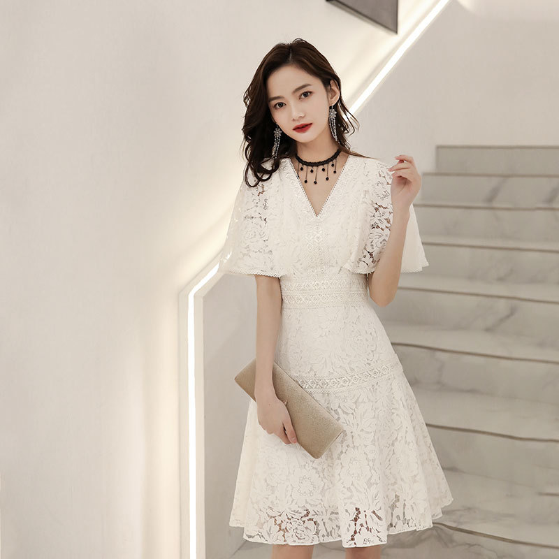 白色v领小礼服裙女夏季新款名媛收腰学生毕业派对蕾丝中裙连衣裙