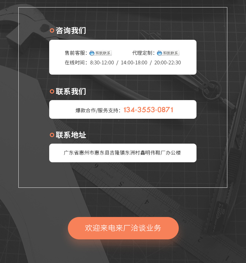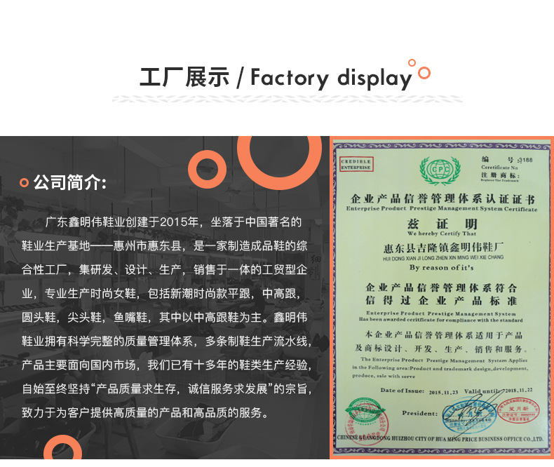 广东鑫明伟鞋业创建于2015年,坐落于中国著名的鞋业生产基地——惠州市惠东县,是一家制造成品鞋的综合性工厂,集研发、设计、生产,销售于一体的工贸型企业,专业生产时尚女鞋,包括新潮时尚款平跟,中高跟,圆头鞋,尖头鞋,鱼嘴鞋,其中以中高跟鞋为主。鑫明伟鞋业拥有科学完整的质量管理体系,多条制鞋生产流水线,,产品主要面向国内市场,我们已有二十多年的鞋类生产经验,自始至终坚持“产品质量求生存,诚信服务求发展”的宗旨,致力于为客户提供高质量的产品和高品质的服务。