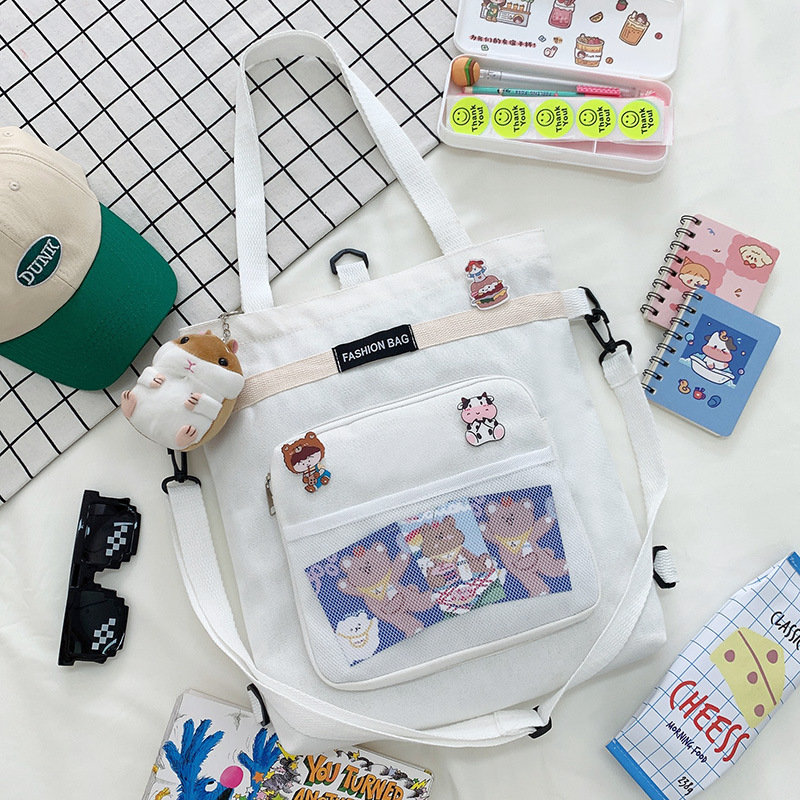 学生单肩斜跨双背三用大容量补习课帆布包包网格小美女包
