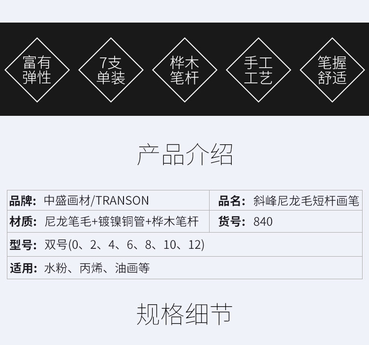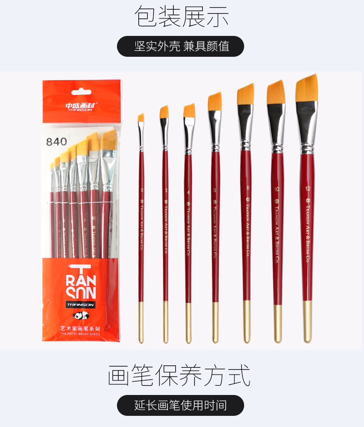 中盛画材 840短杆水粉画笔 尼龙斜峰油画笔 水彩丙烯画笔7支套装