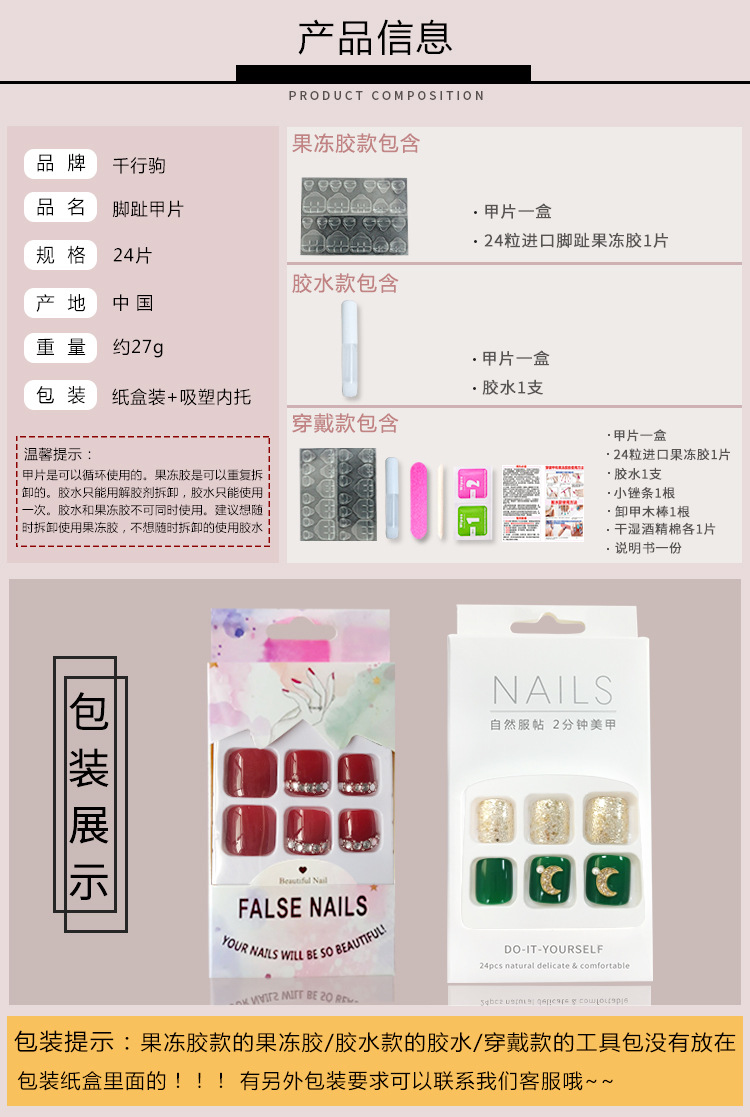 注意:条装的甲片的编号都是TJP开头,普通纸盒胶水款或背胶款是JP开头的,PJP是盼蒂品牌包装穿戴甲,CJP是普通纸盒穿戴甲。