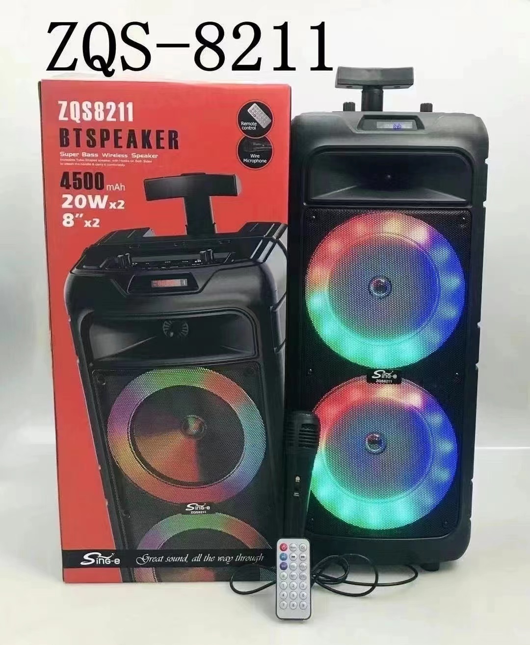 JS-8211蓝牙音箱,USB/TF卡/MIC、DC-5V充电/带AUX(带3.5音频座)+双功放+高音、带锂电保护/电位器音量+USB带5V升压、带显示屏、对箱功能+带幻彩灯、(短按控制幻彩、双8寸 功率:40W 18650电池3.7V/4500MAH ,需要联系18857917188,请安排!
