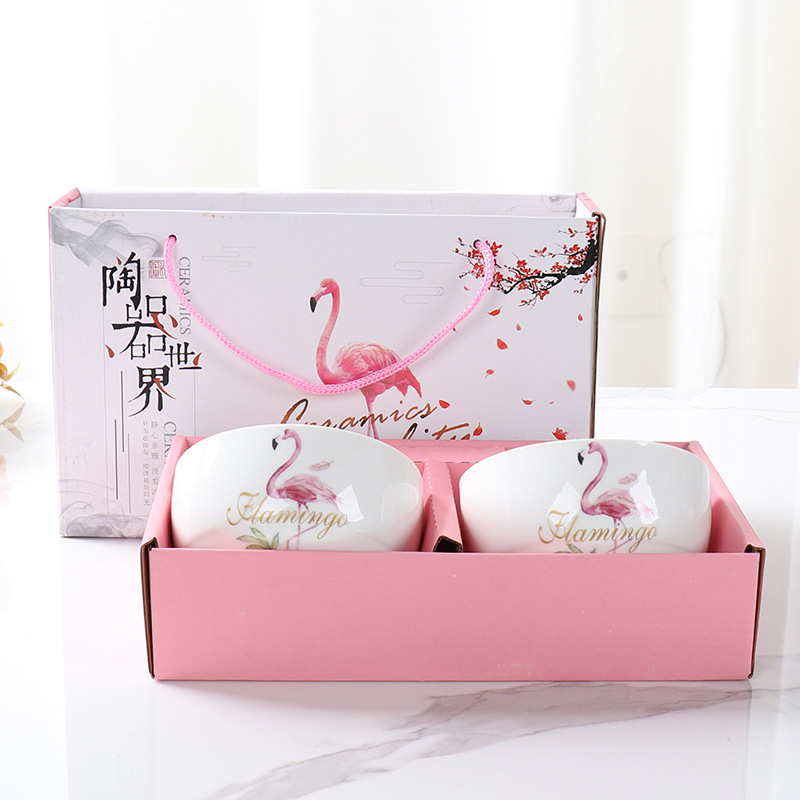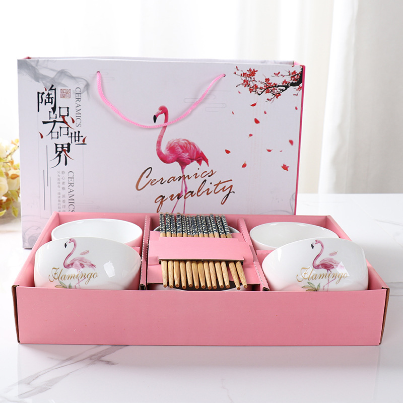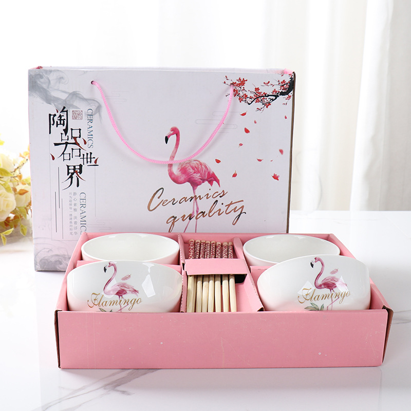 火烈鸟卡通碗筷套装 青花瓷套装碗 陶瓷餐具公司开业蹭送小礼品