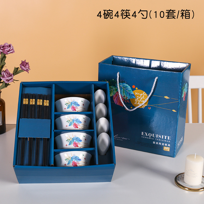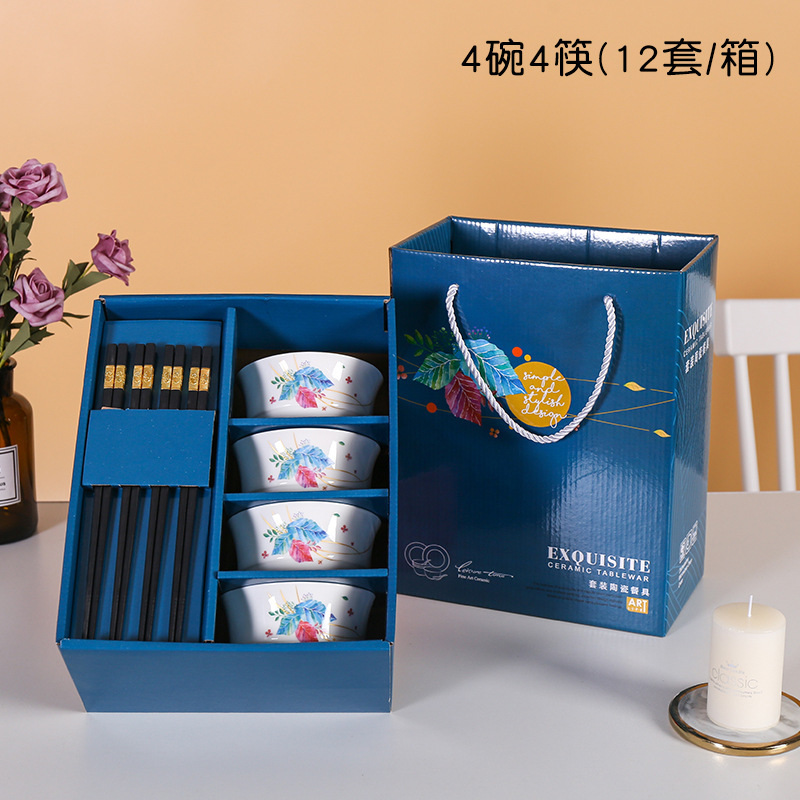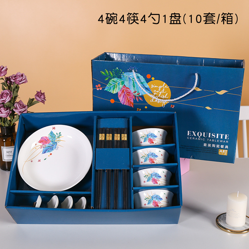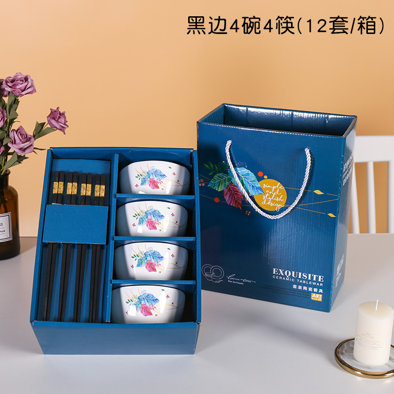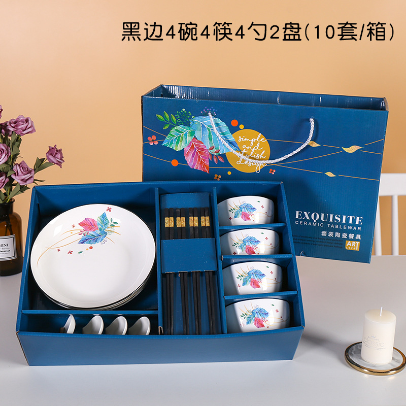 黑线方碗绿叶缤纷 礼盒碗筷套装 碗勺礼品盒碗盘碟餐具套装 加印