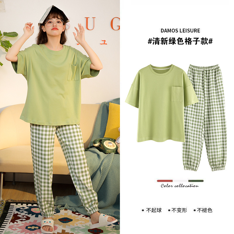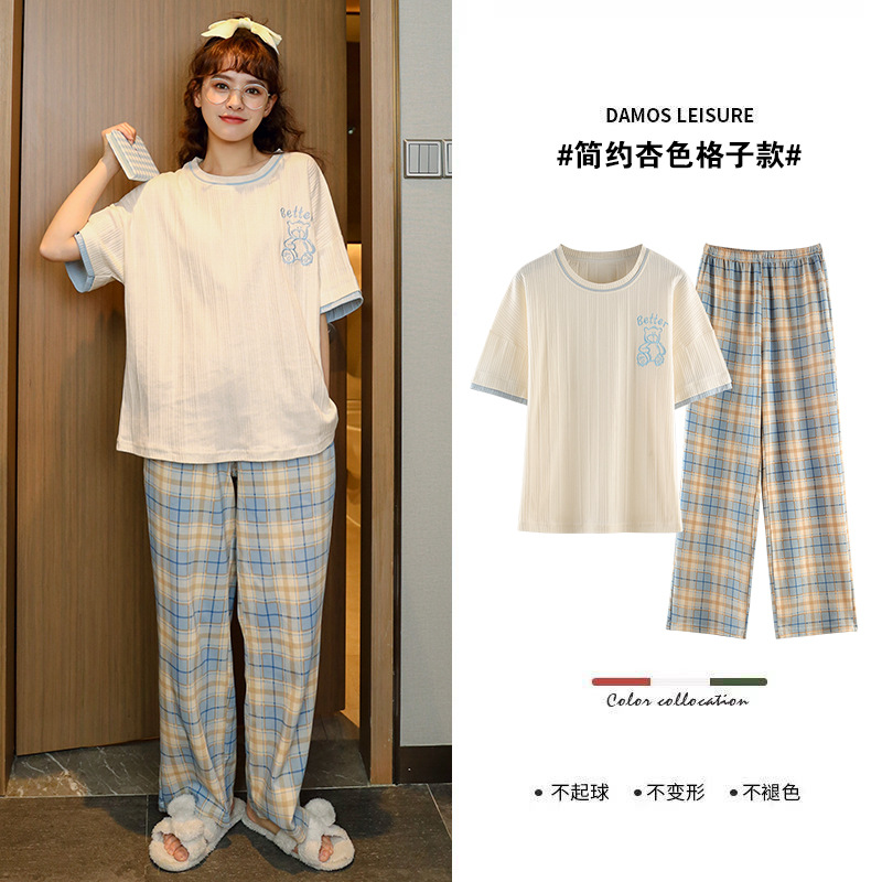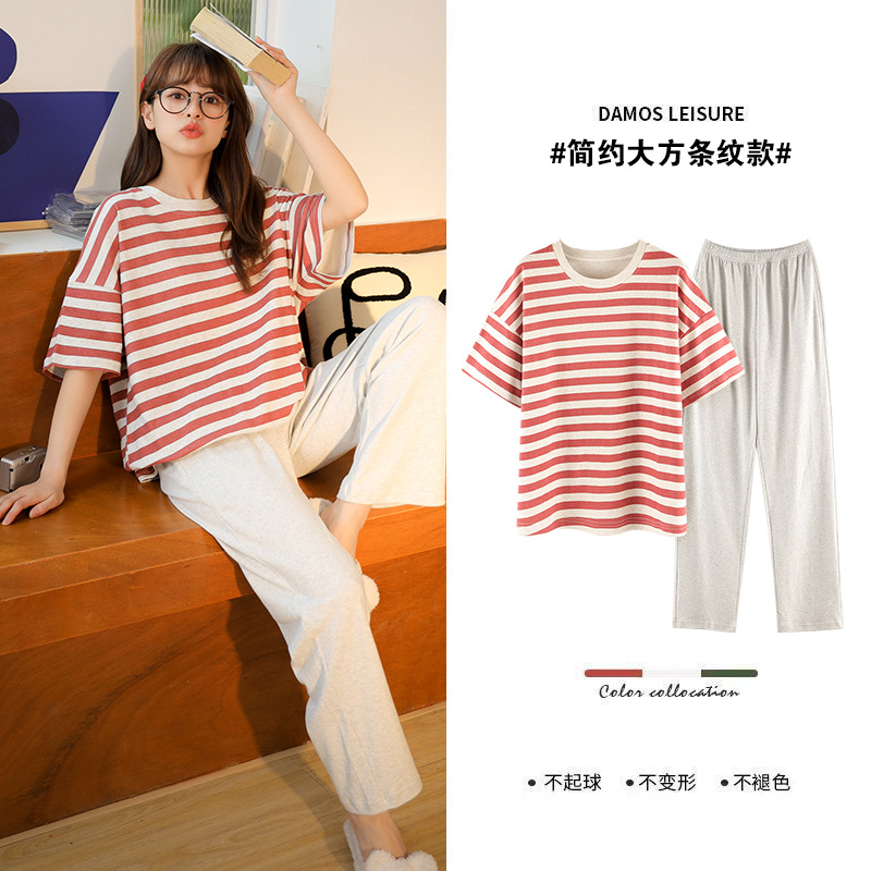 2022新款夏休闲针织棉女士睡衣 可外穿长裤短袖两件套家居服批发