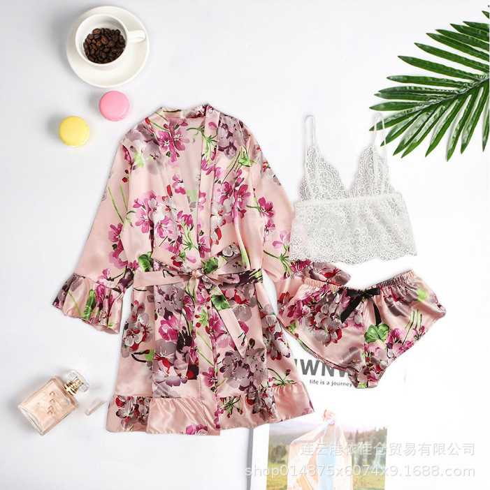 欧美跨境 爆款性感蕾丝情趣内衣吊带三点式裹胸印花内裤浴袍套装