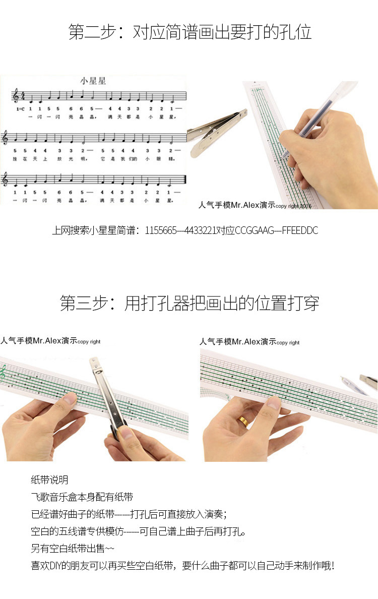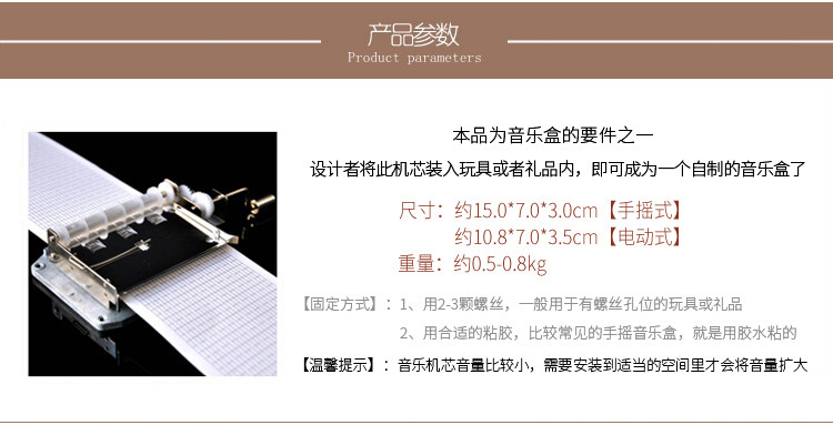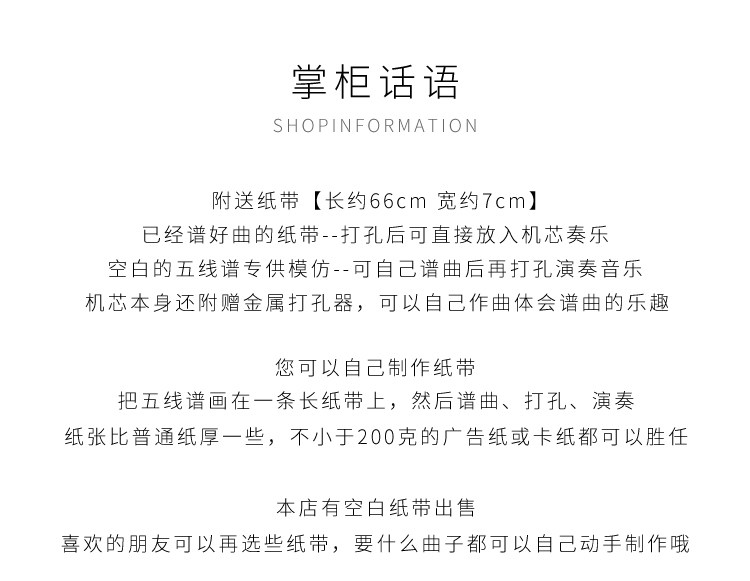 | 30 tone hand-cranking movement +15 blank paper tape +15 music paper tape + puncher(30音手摇机芯+15空白纸带+15谱曲纸带+打孔器) | USD $19.16 | 31942 piece available |