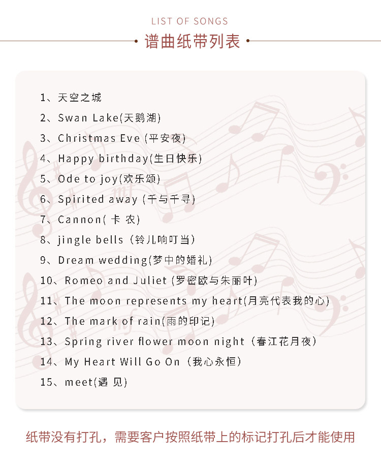 | 30-tone electric movement +20 blank paper strips + puncher(30音电动机芯+20条空白纸带+打孔器) | USD $50.66 | 99990 piece available |