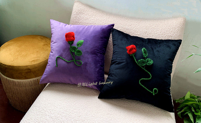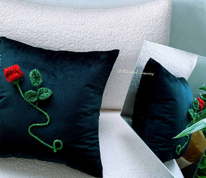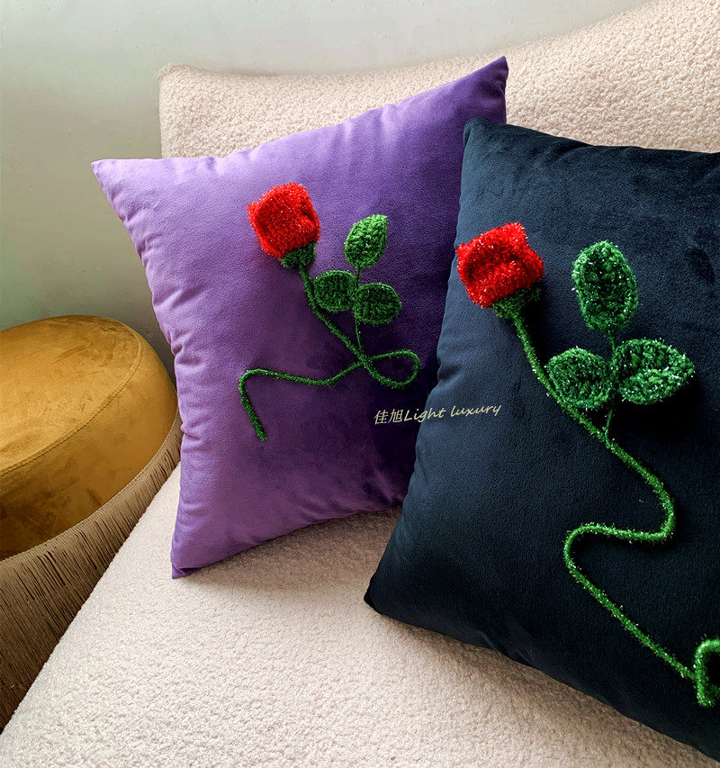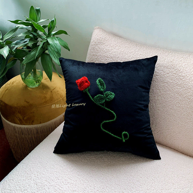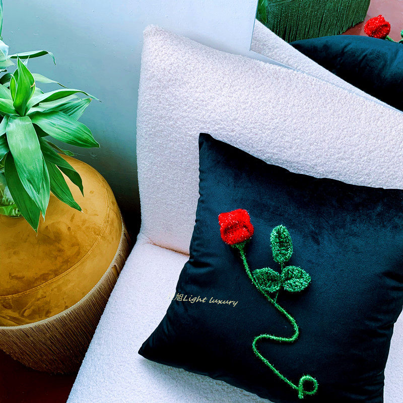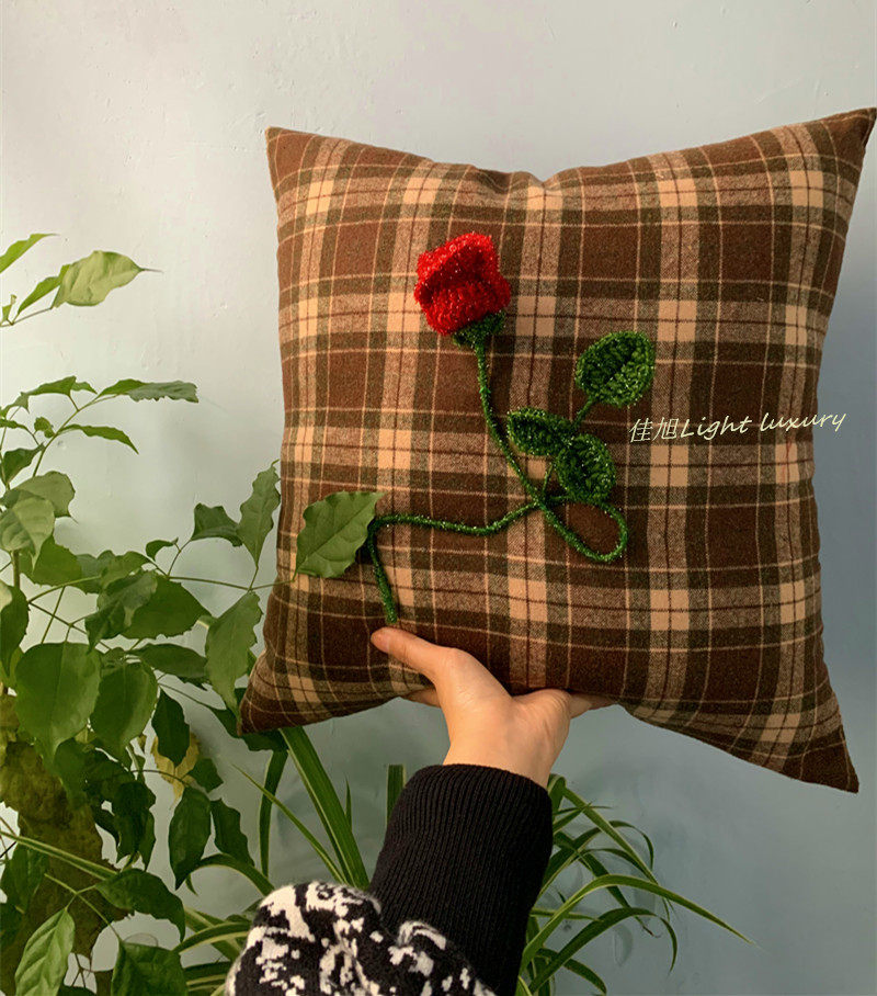 复古抱枕羊毛呢格子布立体红玫瑰花朵靠枕垫暗夜花园系列手工钩绣