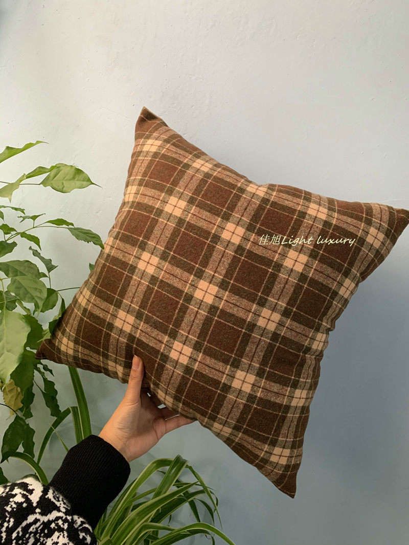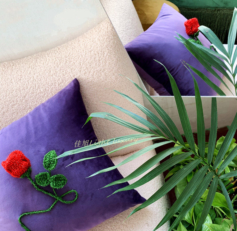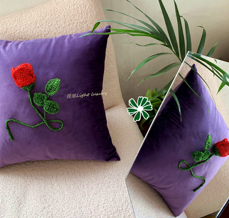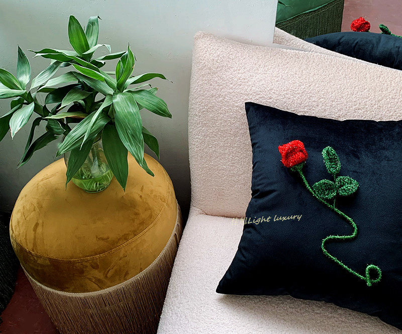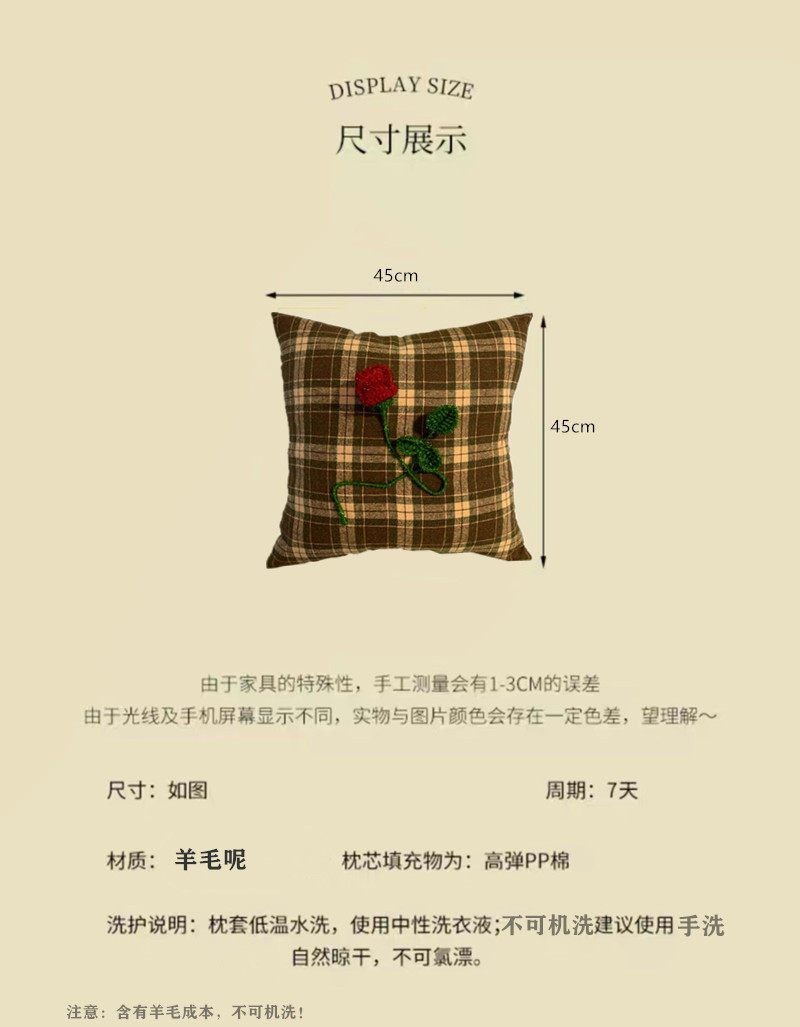 复古抱枕羊毛呢格子布立体红玫瑰花朵靠枕垫暗夜花园系列手工钩绣