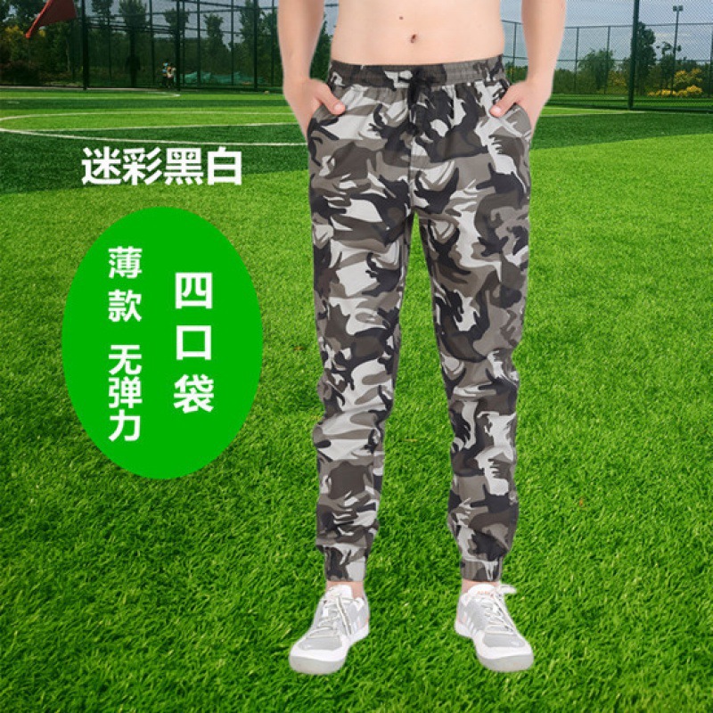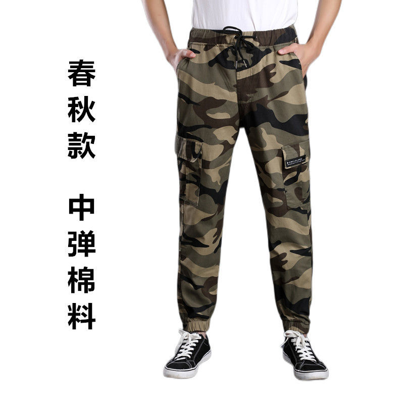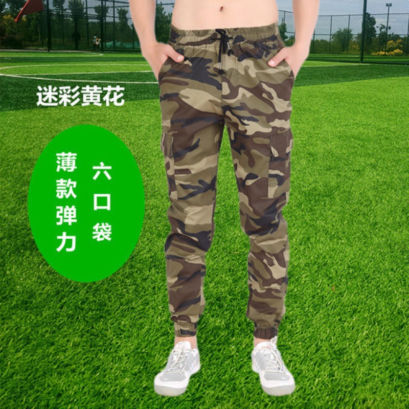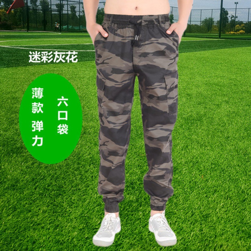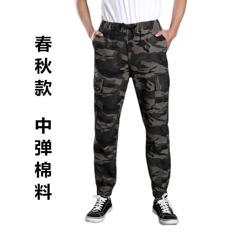 棉夏季薄款宽松耐磨松紧腰迷彩小脚工装裤男潮牌束脚工作服裤子