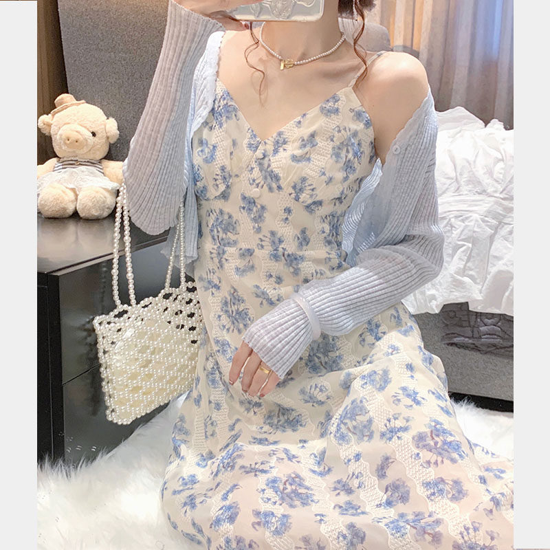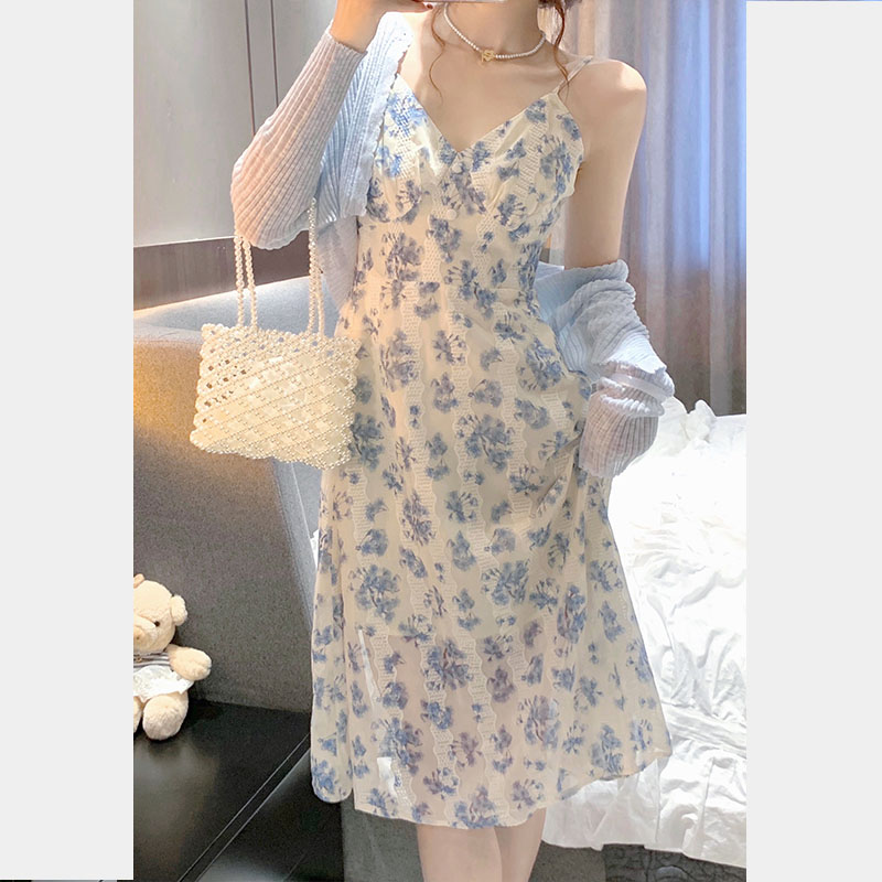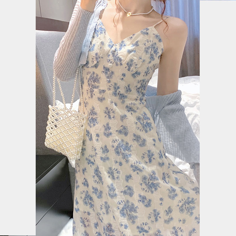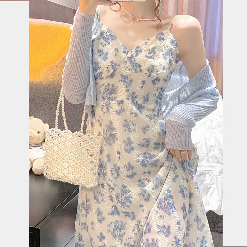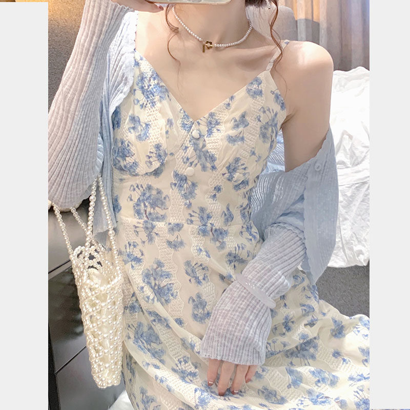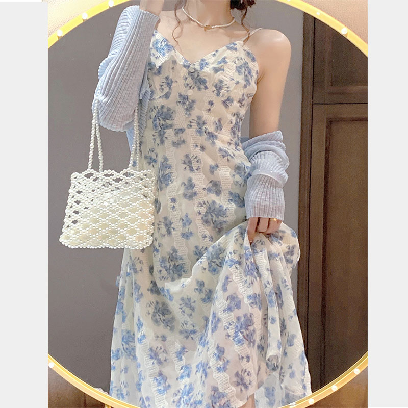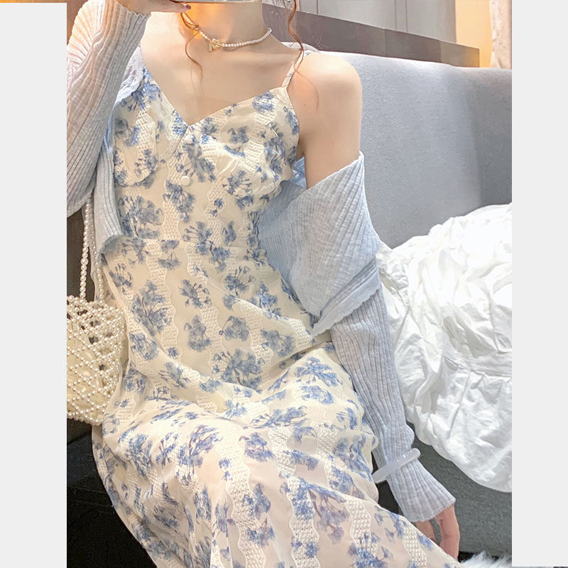 2022早春法式初恋减龄森系甜美盐系炸街约会吊带碎花连衣裙两件套