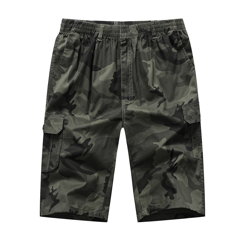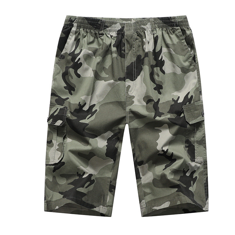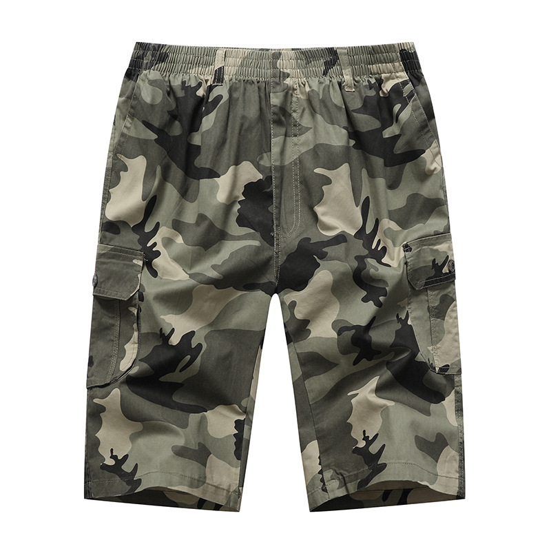 夏季纯棉男士工装迷彩七分裤男 肥佬松紧腰多袋短裤休闲大码短裤