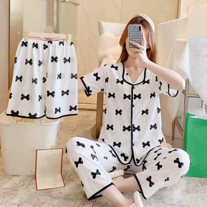 夏季爆款蝴蝶结睡衣三件套家居服女小熊睡衣套装开衫短袖短裤长裤