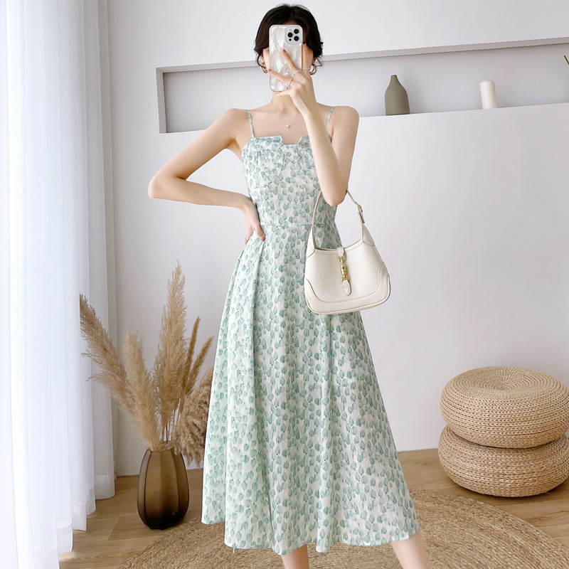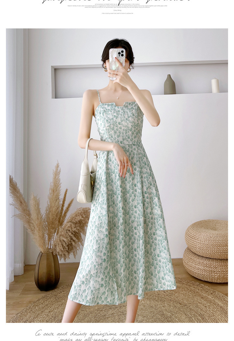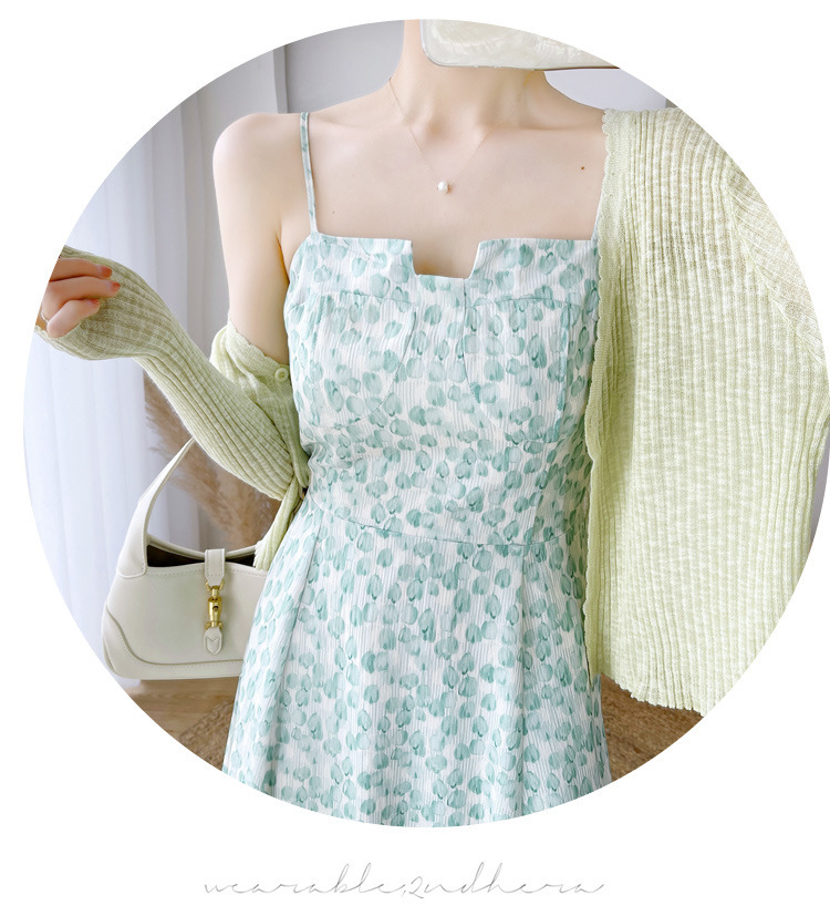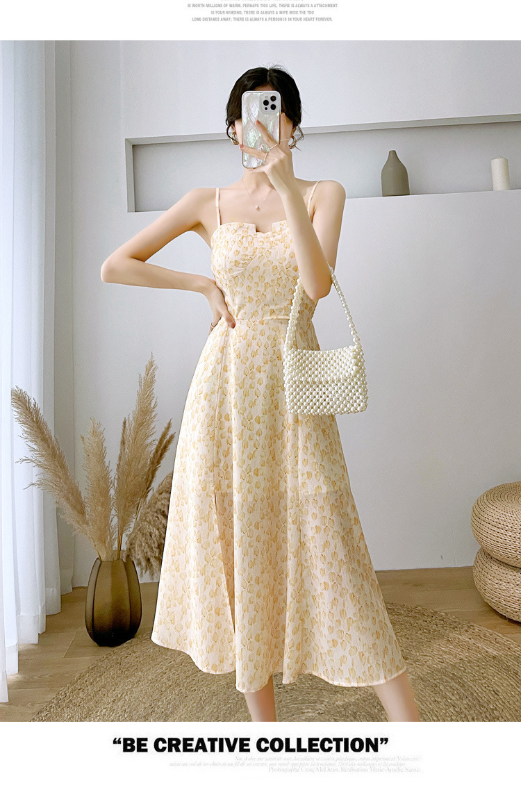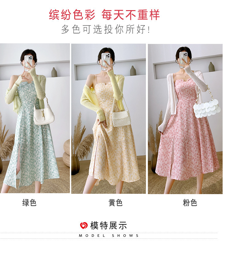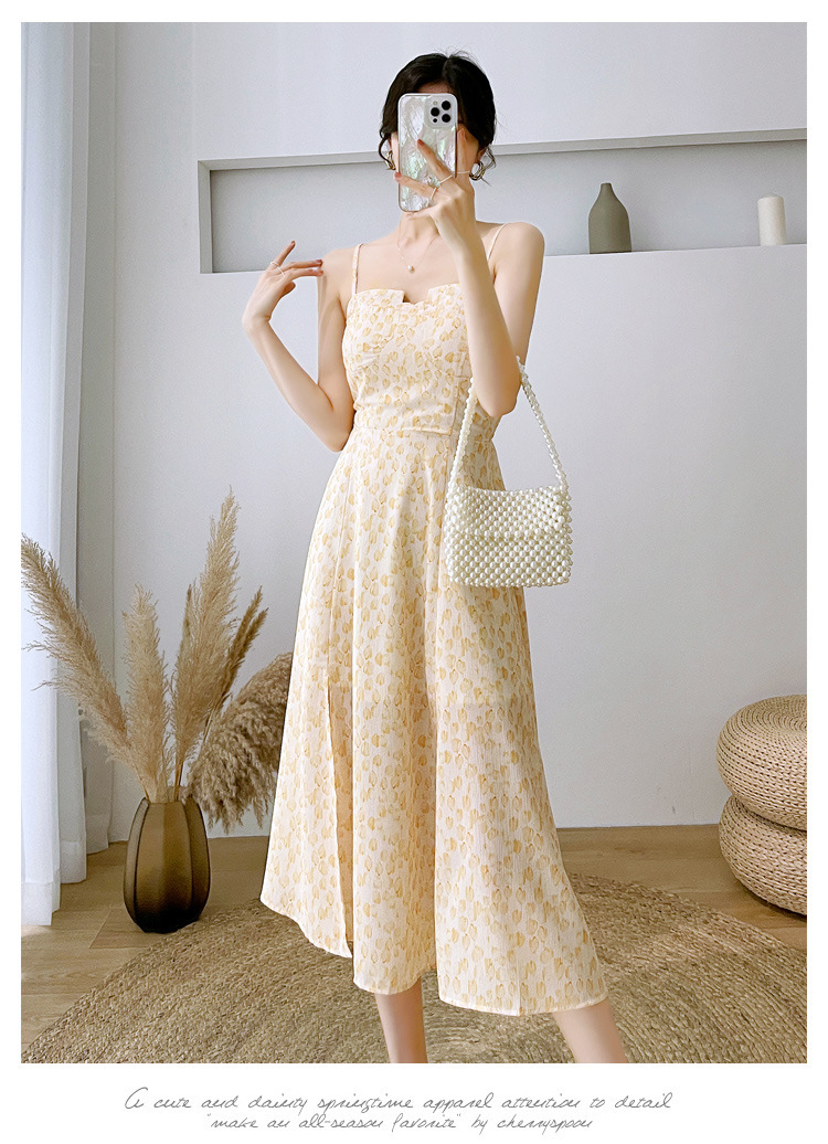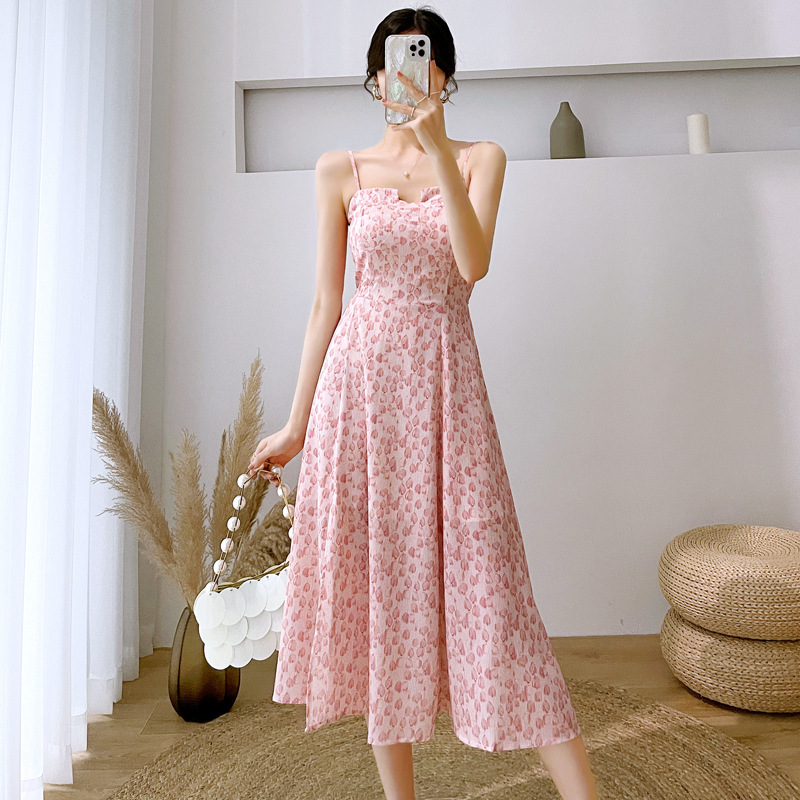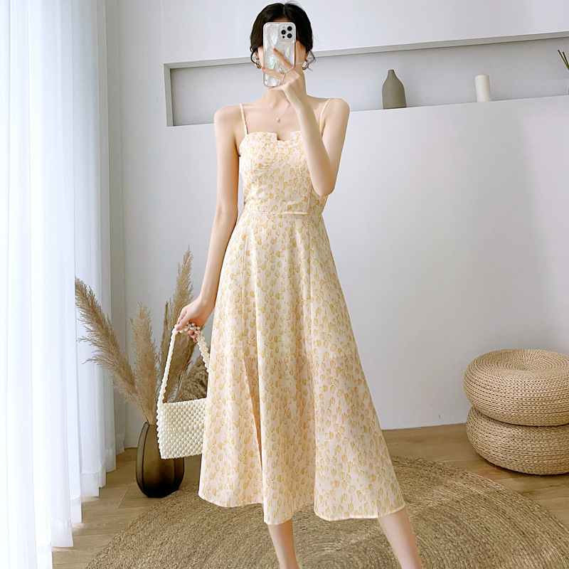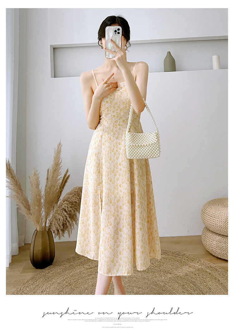茶歇法式气质显瘦雪纺吊带连衣裙女夏季甜美气质修身显瘦开叉长裙