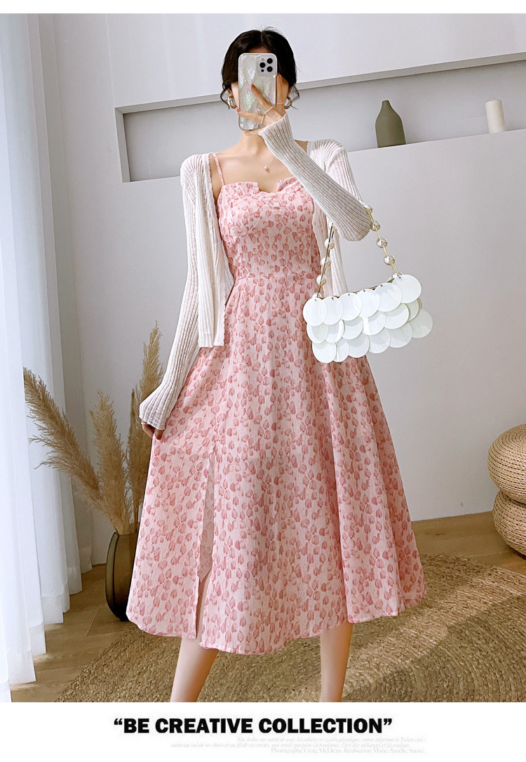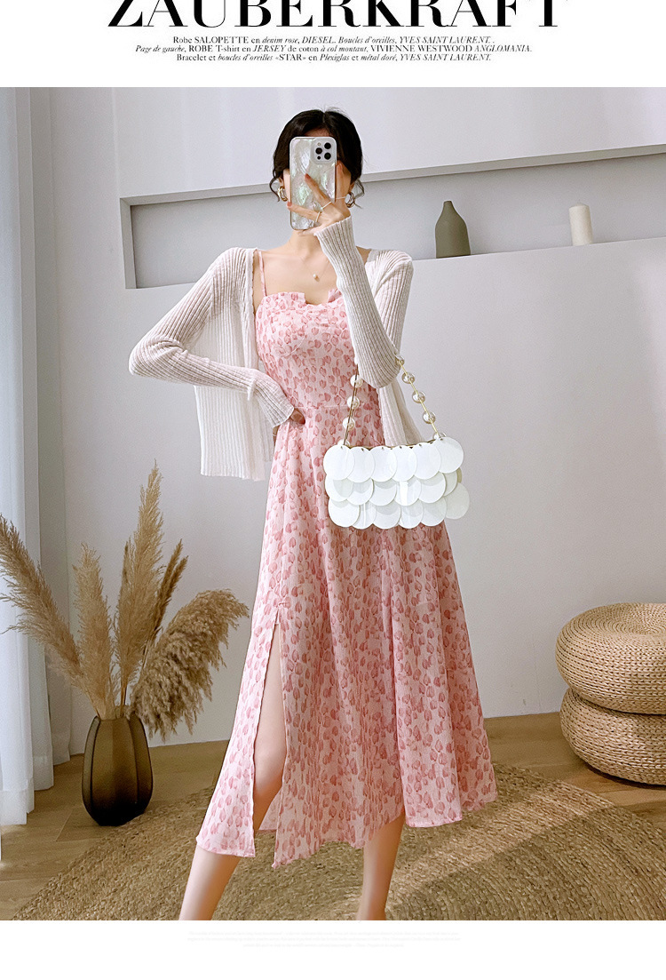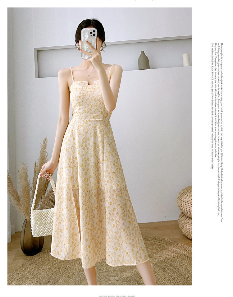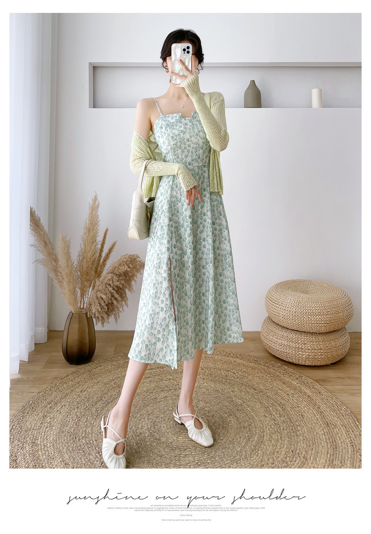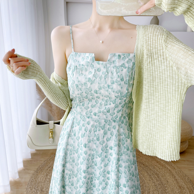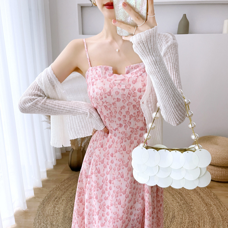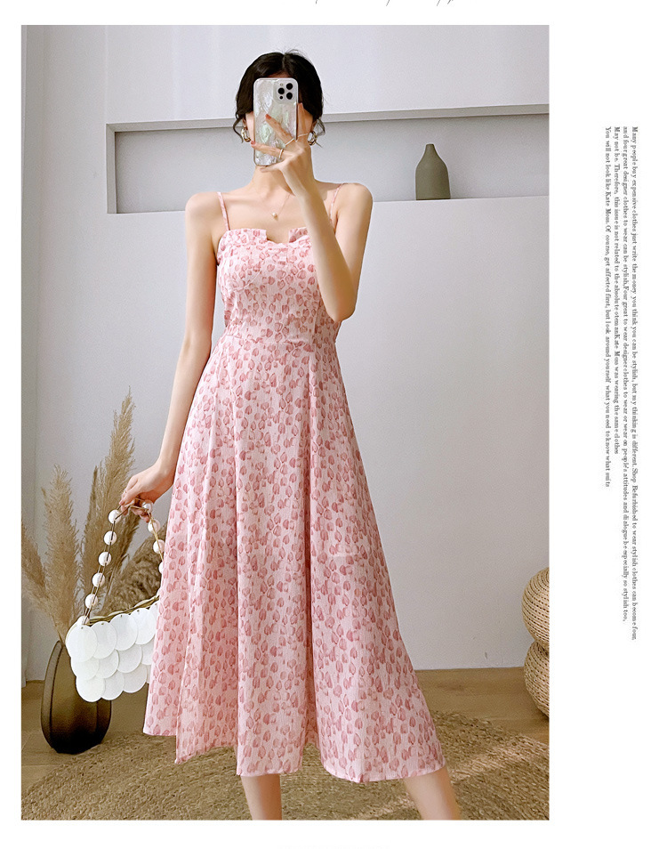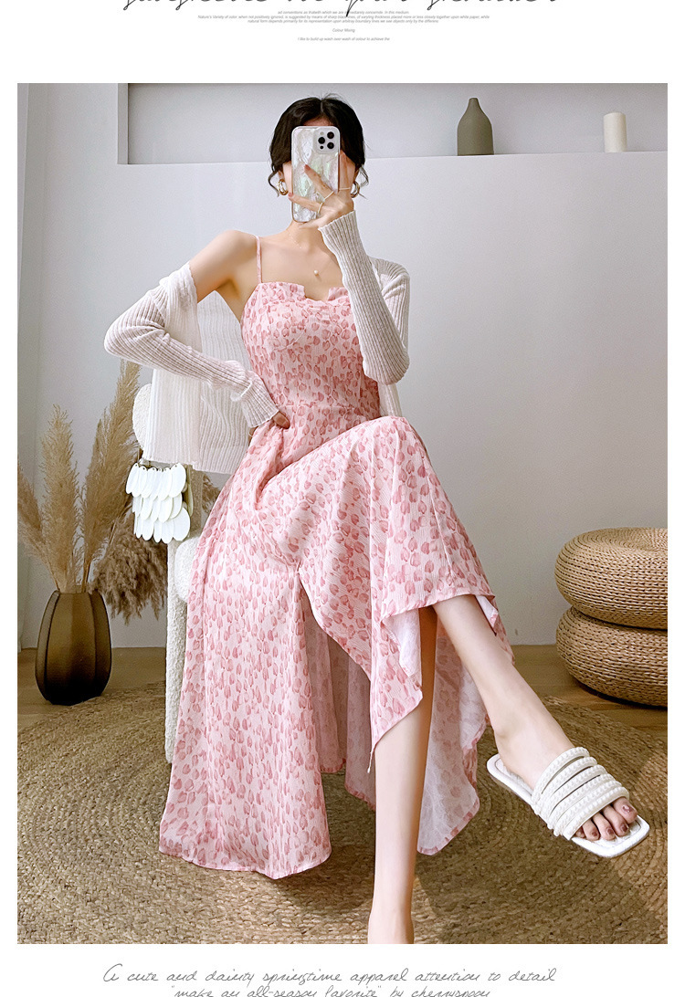 茶歇法式气质显瘦雪纺吊带连衣裙女夏季甜美气质修身显瘦开叉长裙