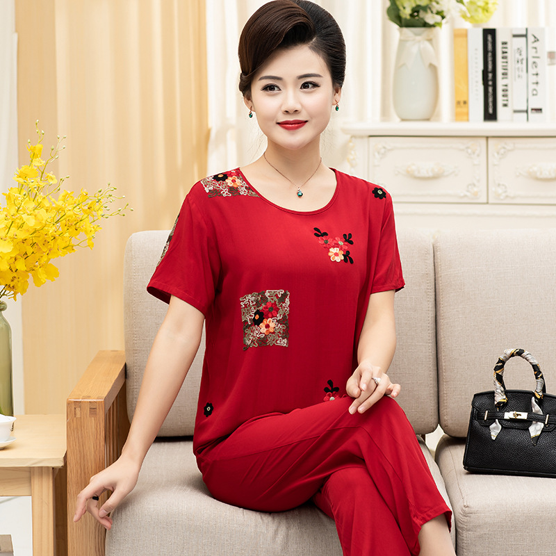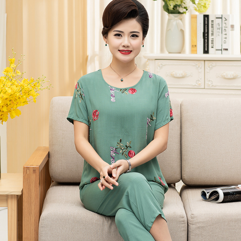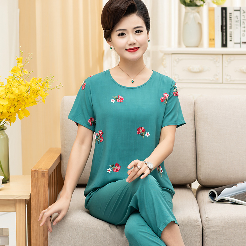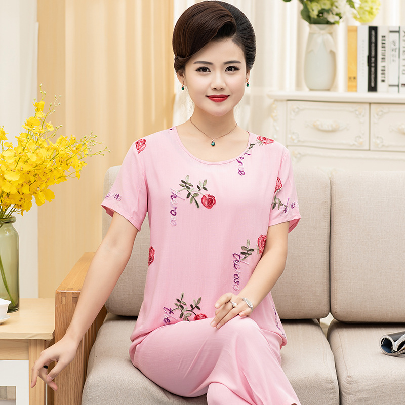中老年棉绸睡衣女夏季薄款短袖两件套装绵绸人造棉宽松绣花家居服