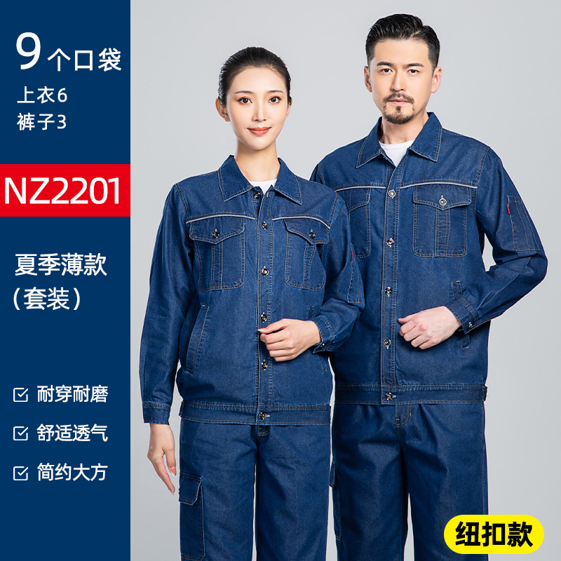 夏季牛仔工作服套装男反光长袖薄款电焊工厂车间工装劳保服