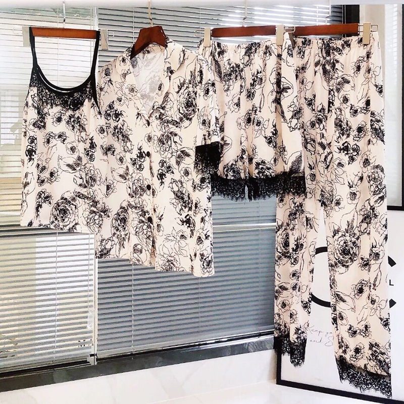 闺蜜小主蔷薇花蕾丝四件套冰丝居家服水墨画升级款舒适宽松四件套
