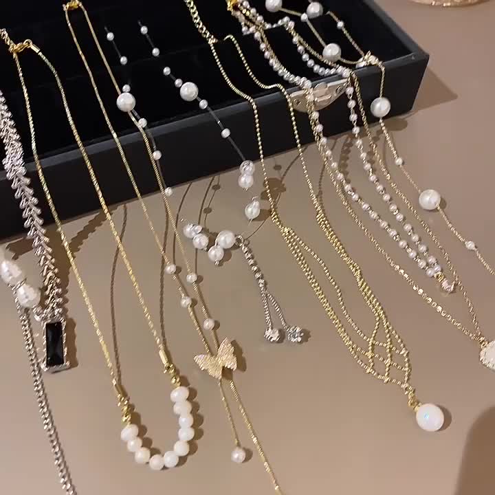 饰品批发小众珍珠项链女百搭拼接爱心锁骨链轻奢气质串珠项链批发