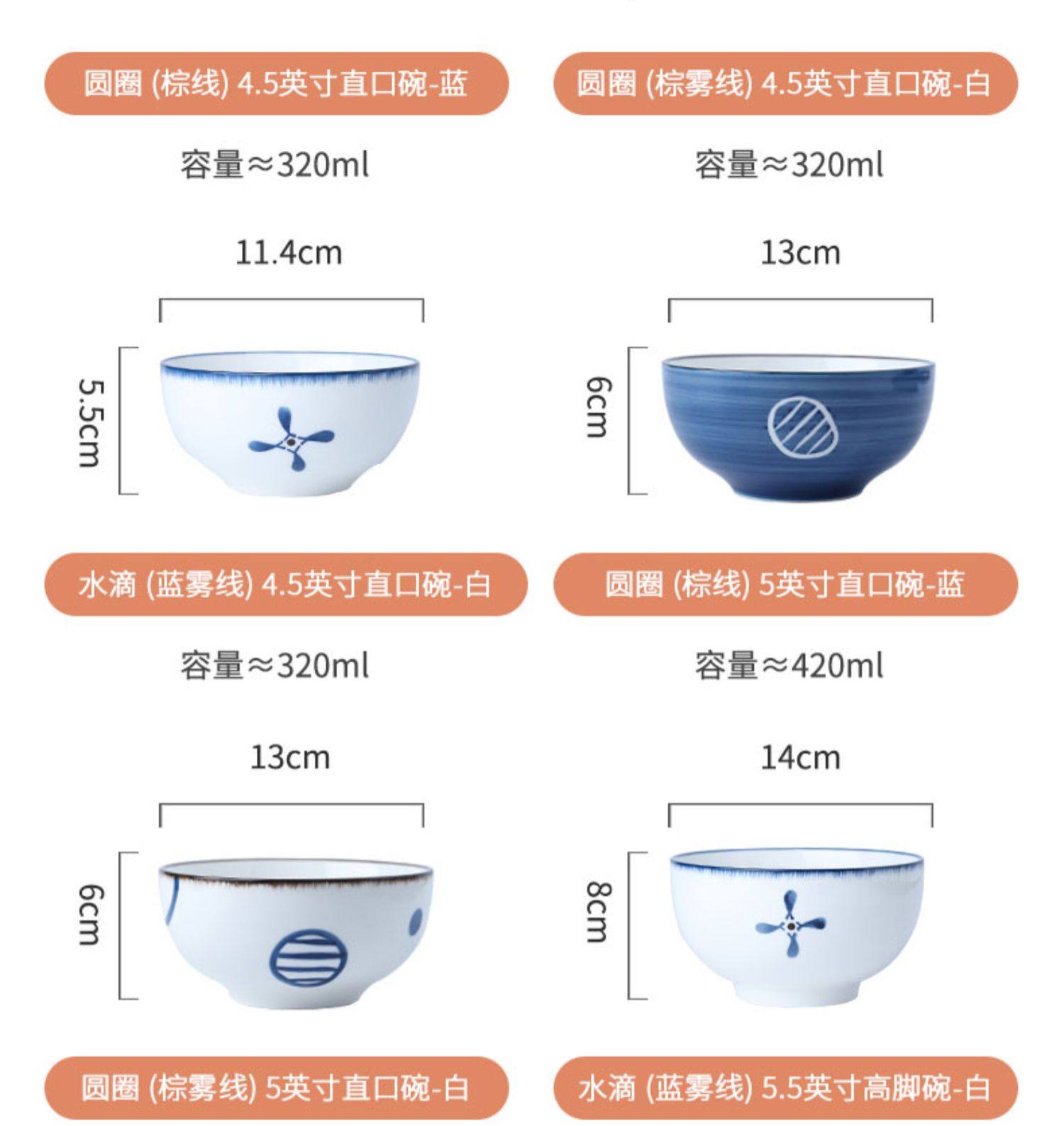 | 4.5-inch upright-mouthed bowl inner white outer blue-circle + brown line(4.5寸直口碗内白外蓝-圆圈+棕线) | USD $0.68 | 48 piece available |