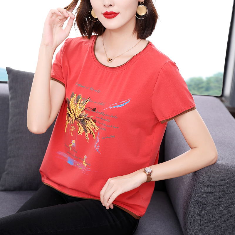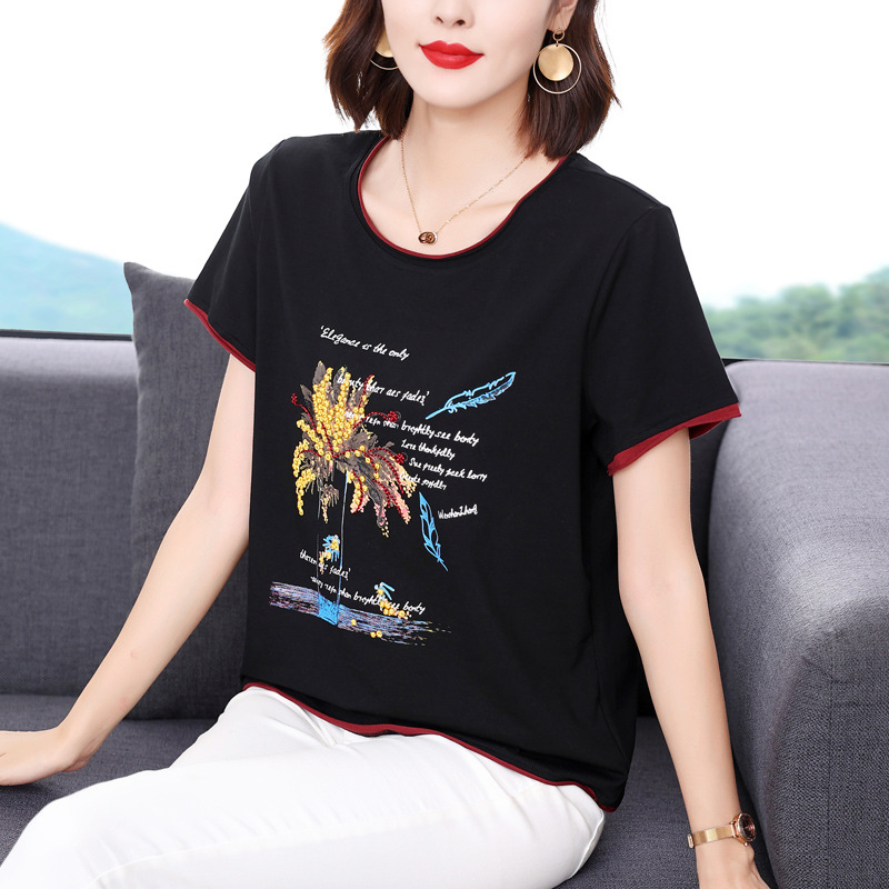2022夏季新款妈妈棉短袖t恤女宽松大码绣花中老年半袖