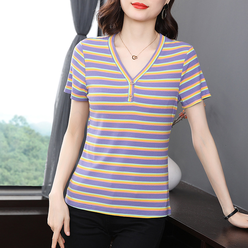 2022新款夏季休闲百搭条纹t恤女韩版时尚体恤v领短袖网红小众上衣