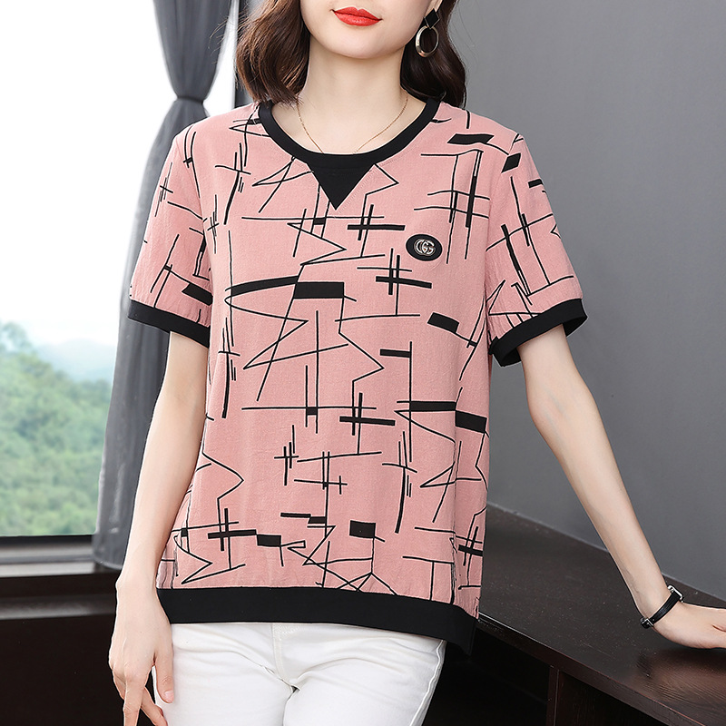 2022夏新款胖妈妈印花上衣纯棉短袖t恤女中年大码宽松遮肚子小衫