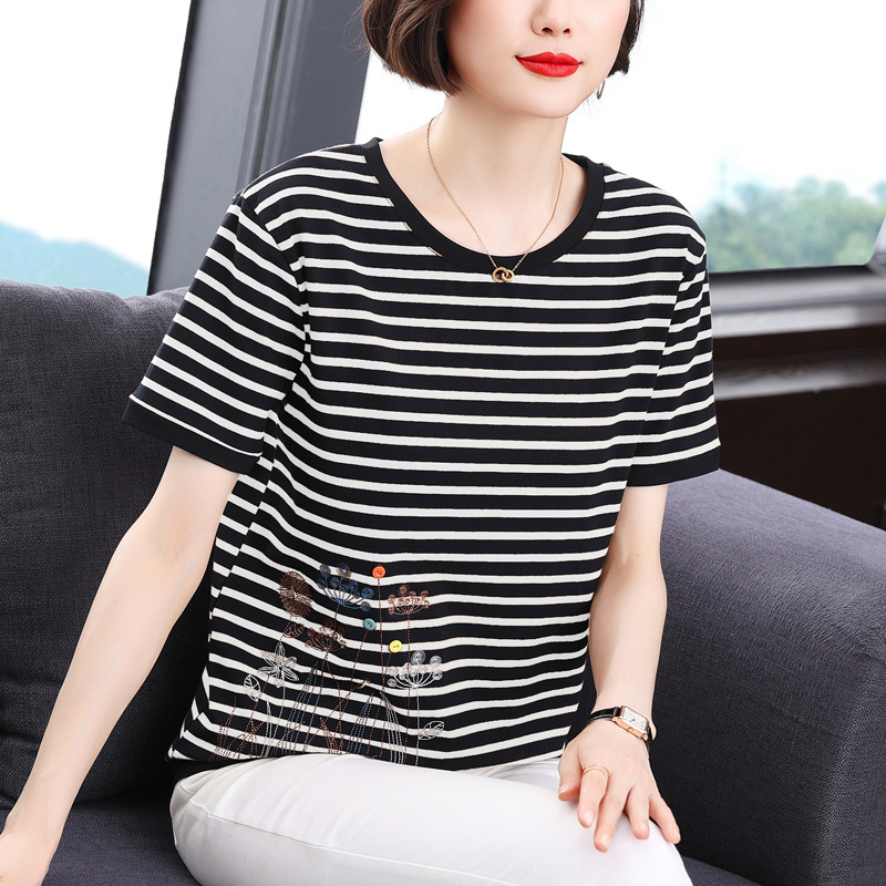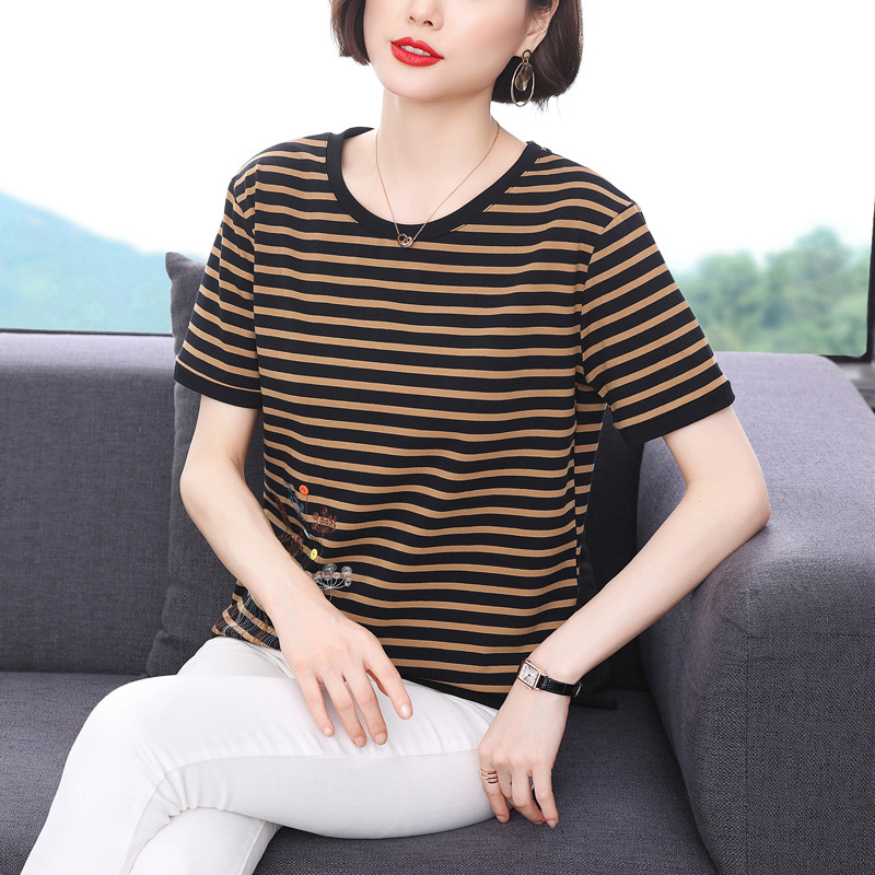2022年夏季新款韩版遮肚显瘦中年妈妈条纹t恤女短袖宽松上衣