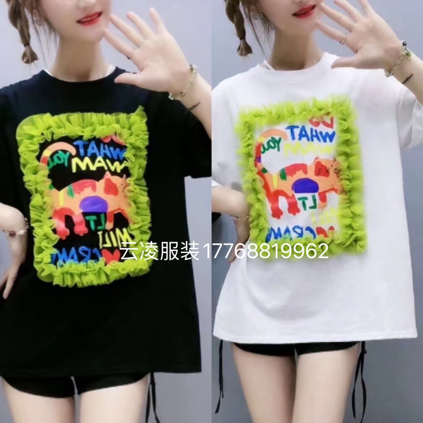 实拍网纱彩色字母大版短袖T恤女 宽松韩版夏季百搭圆领地摊短袖