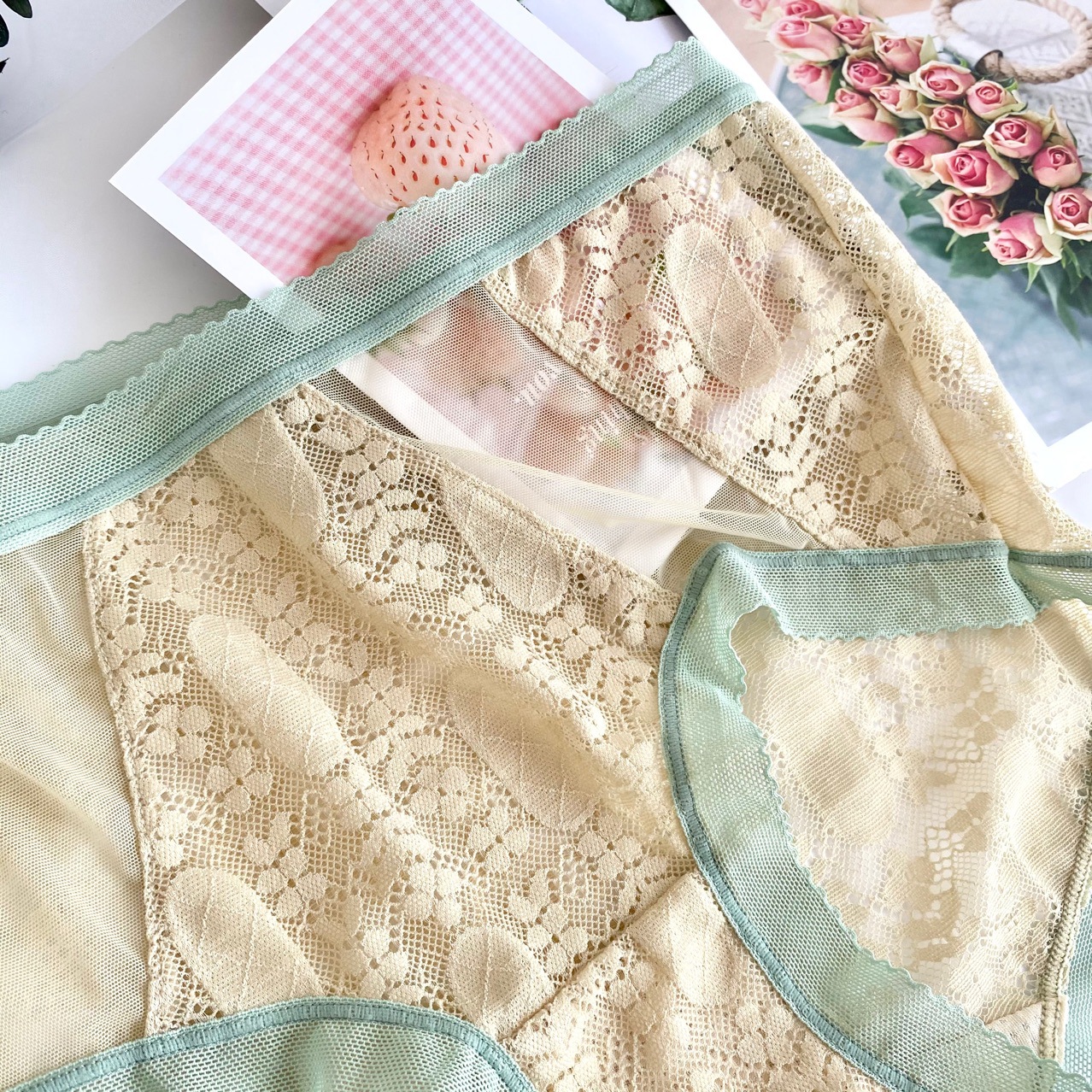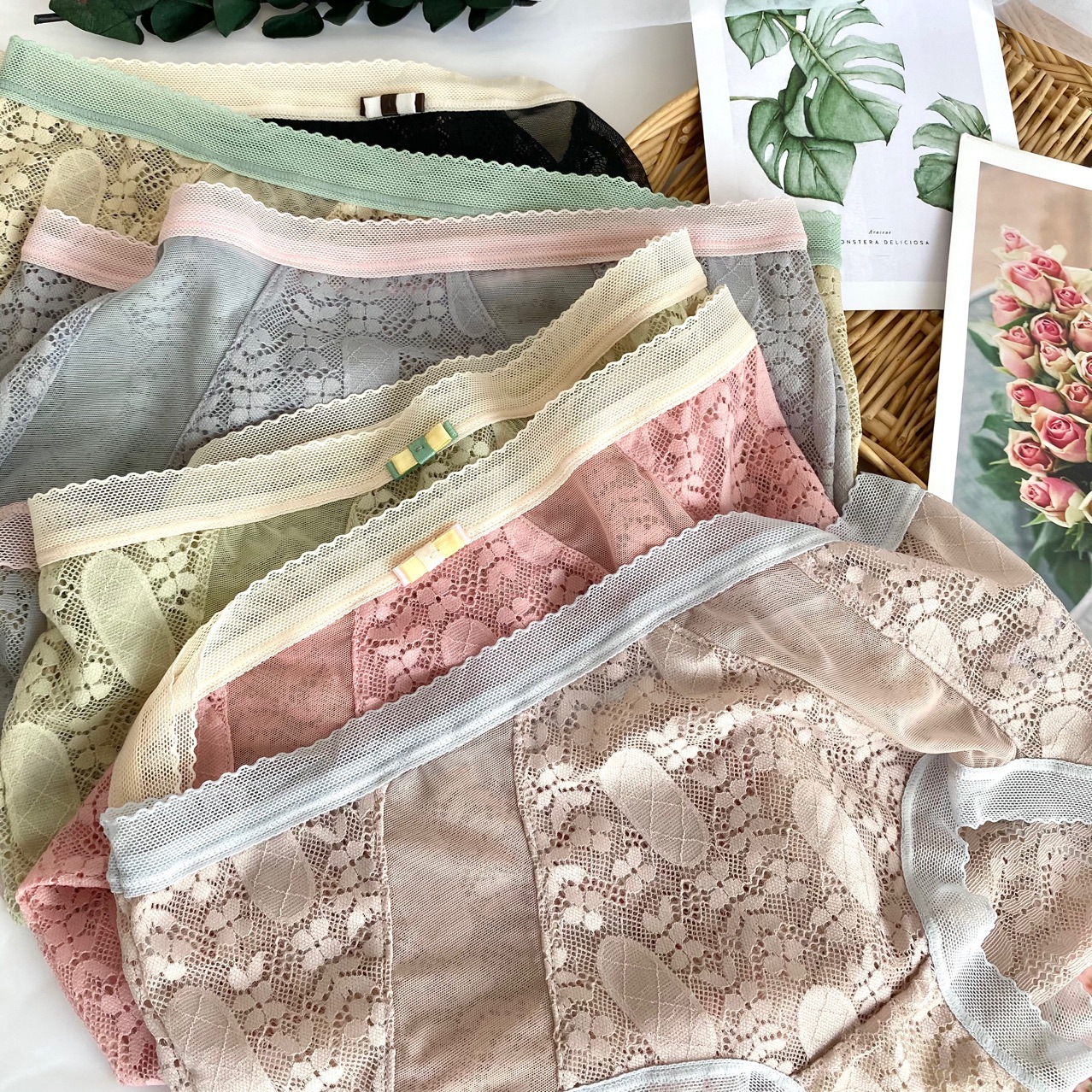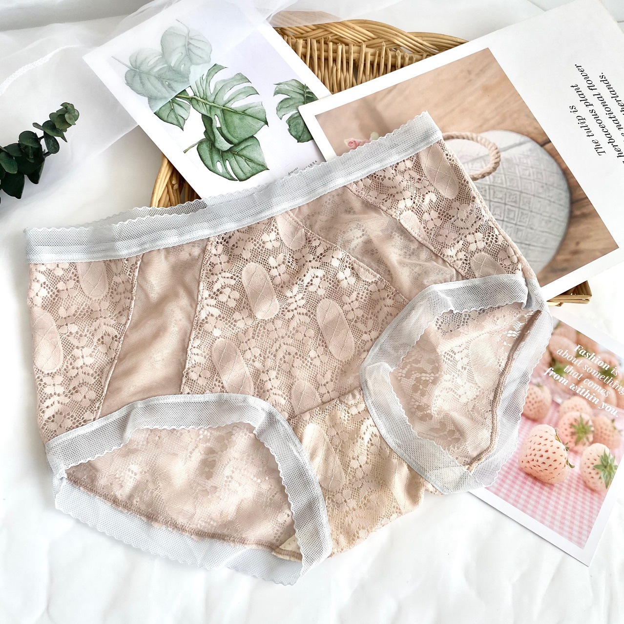 2022高端大码撞色蕾丝边中腰透气舒适棉档透明女士包臀内裤品牌