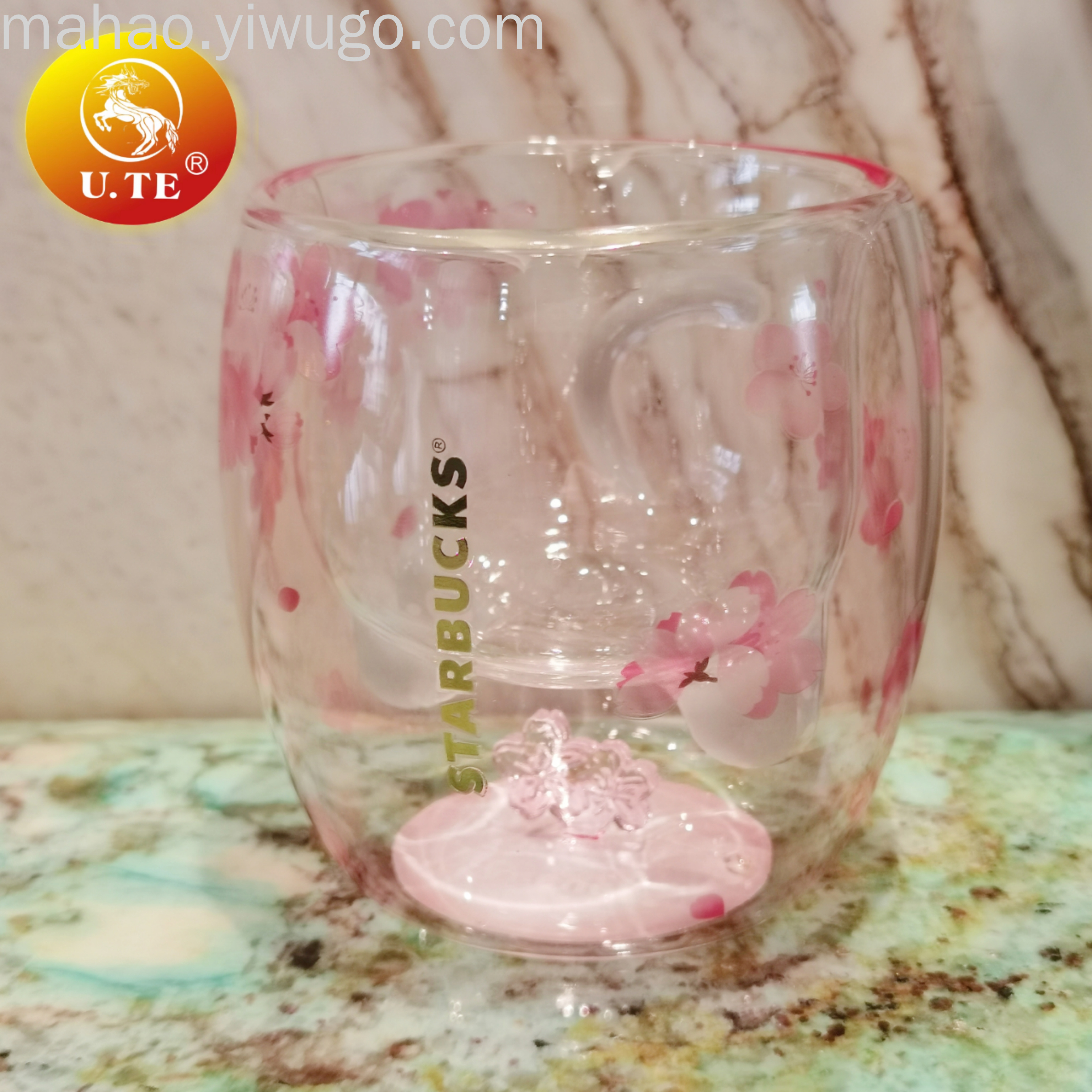 粉色樱花猫头高硼硅双层防爆玻璃杯