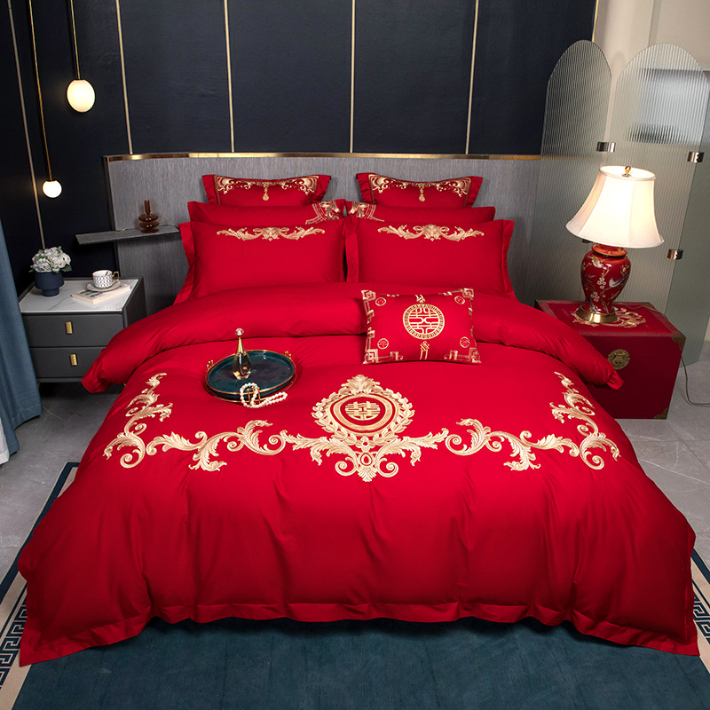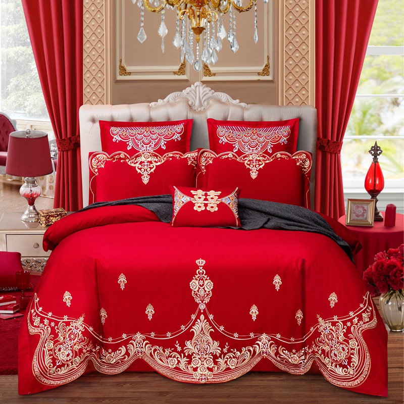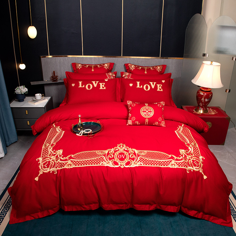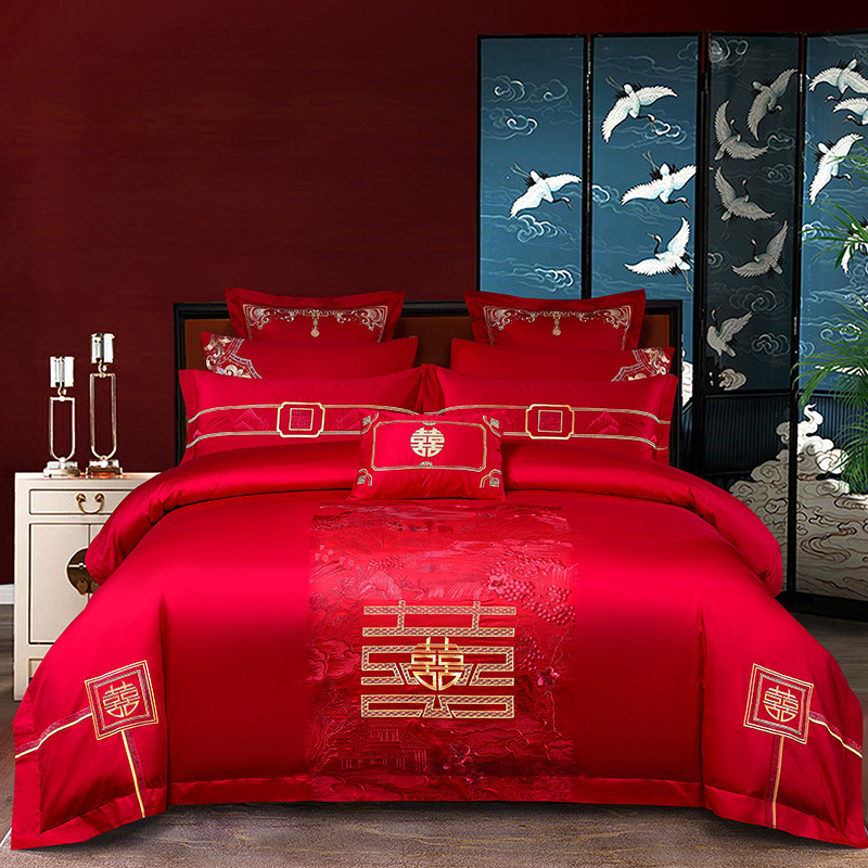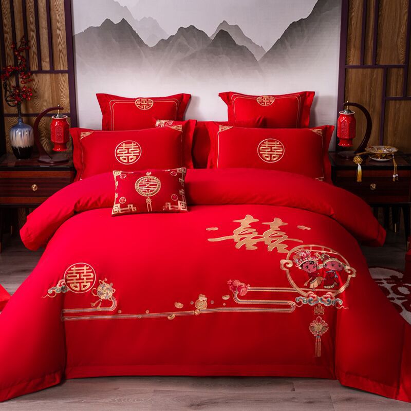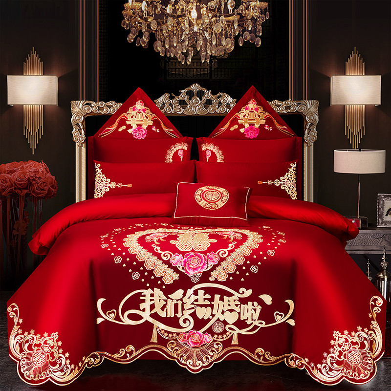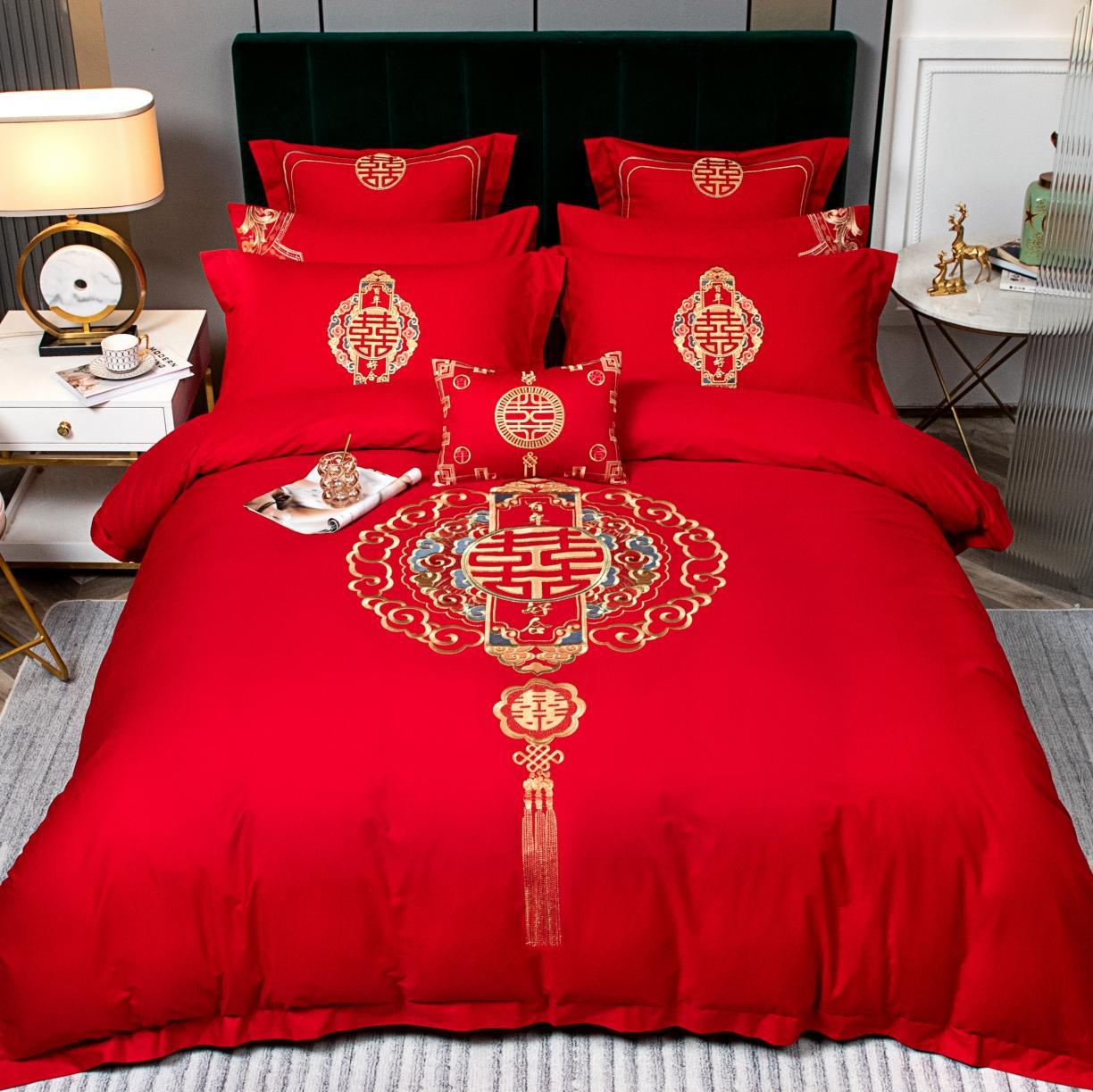 100支新疆长绒棉婚庆四件套大红喜庆结婚床单床盖被套新婚四件套