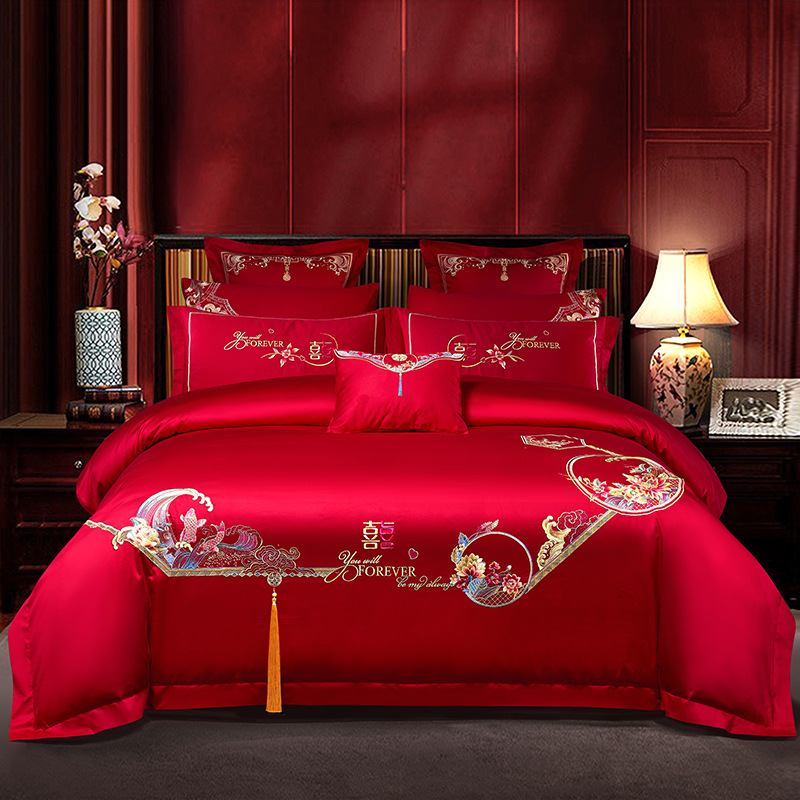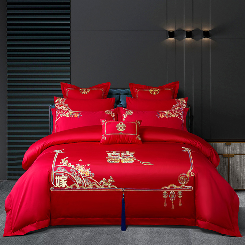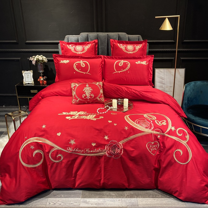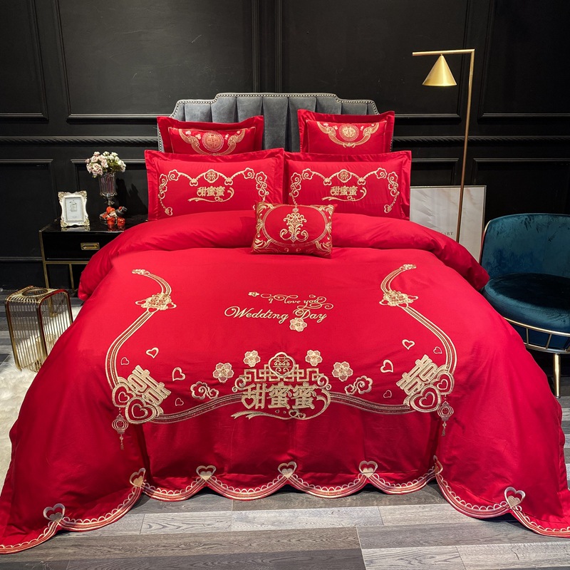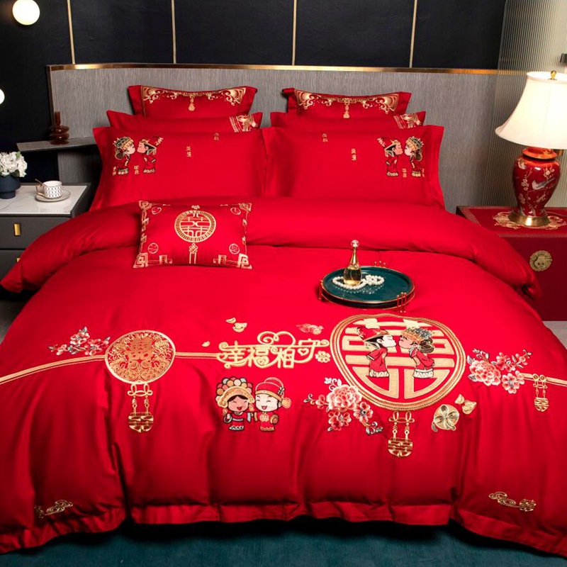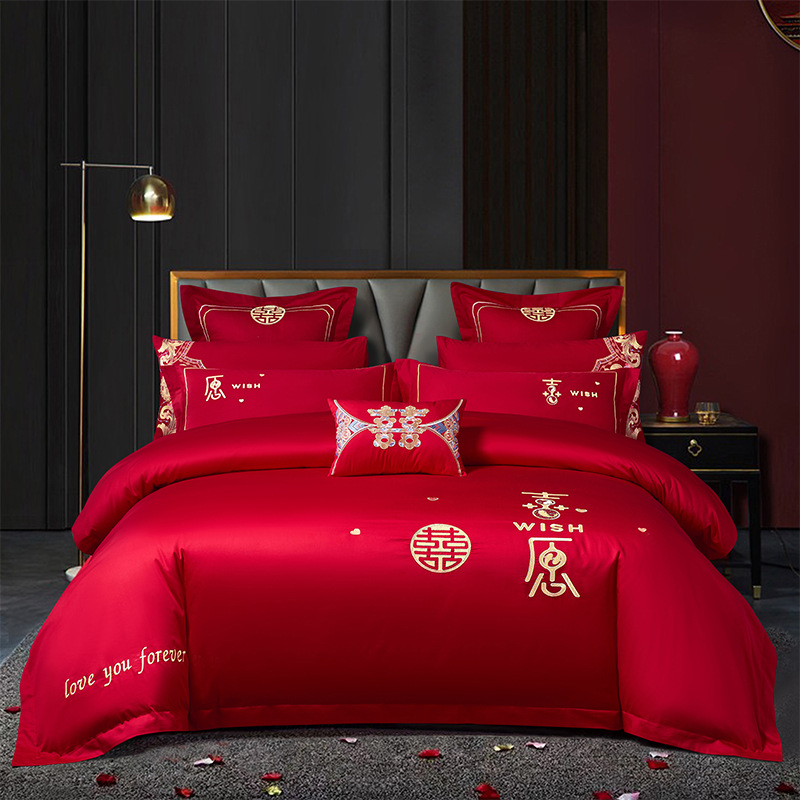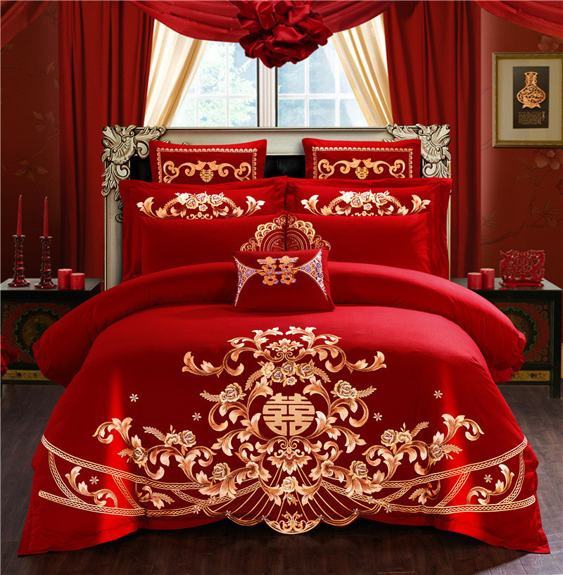 100支新疆长绒棉婚庆四件套大红喜庆结婚床单床盖被套新婚四件套
