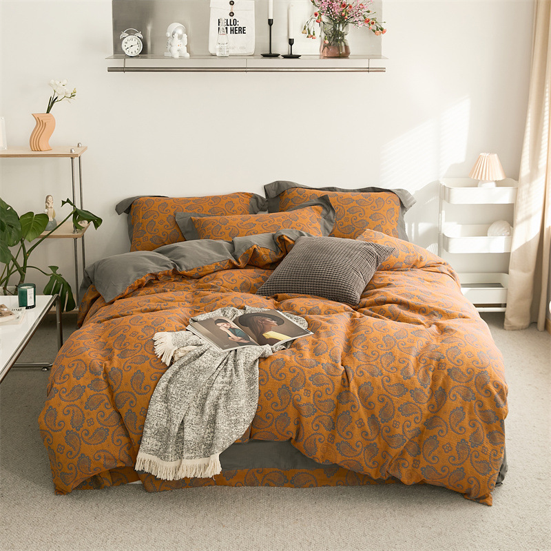 全棉双层纱四件套色织提花纯棉婴幼级裸睡被套床单复古风床上用品