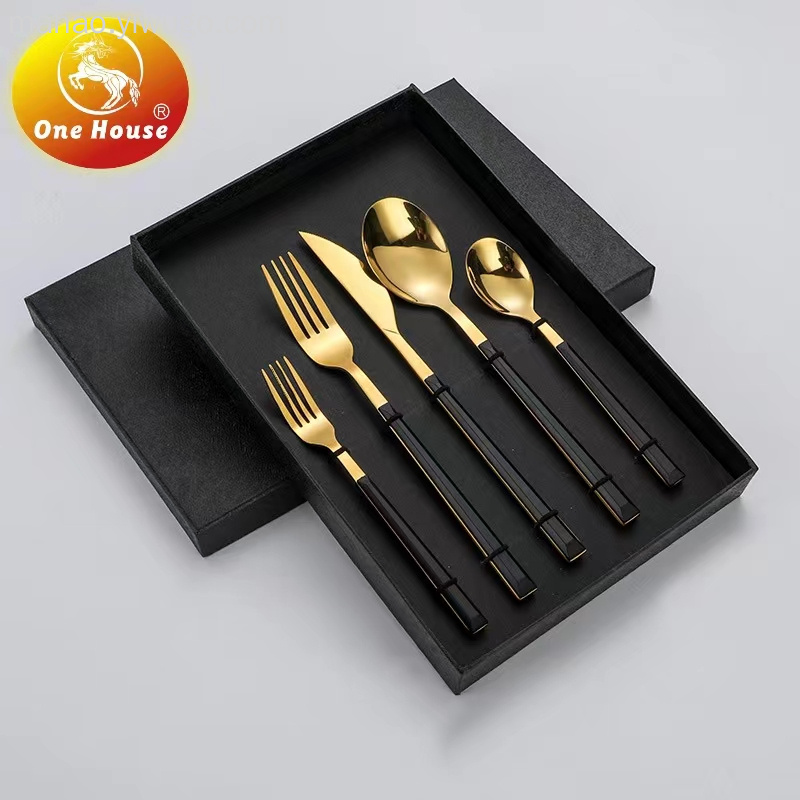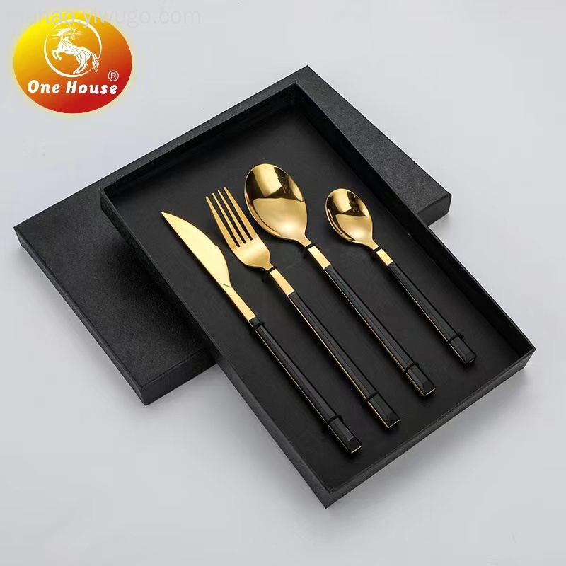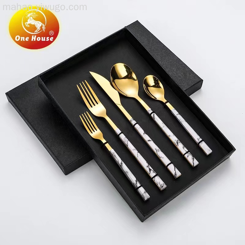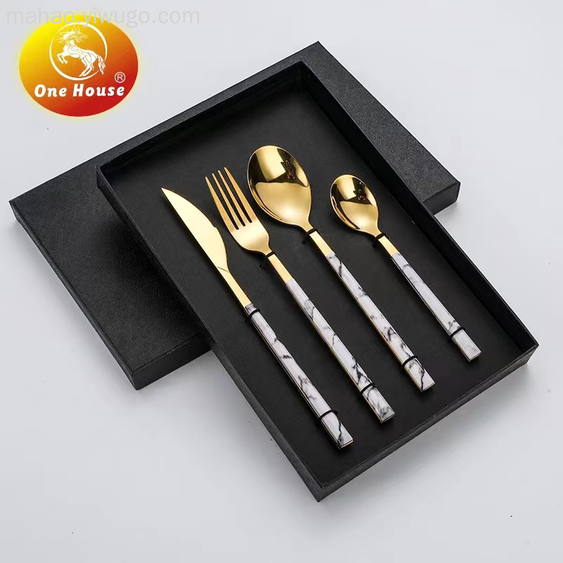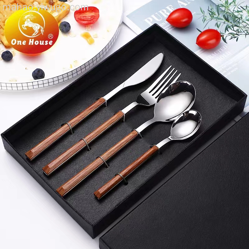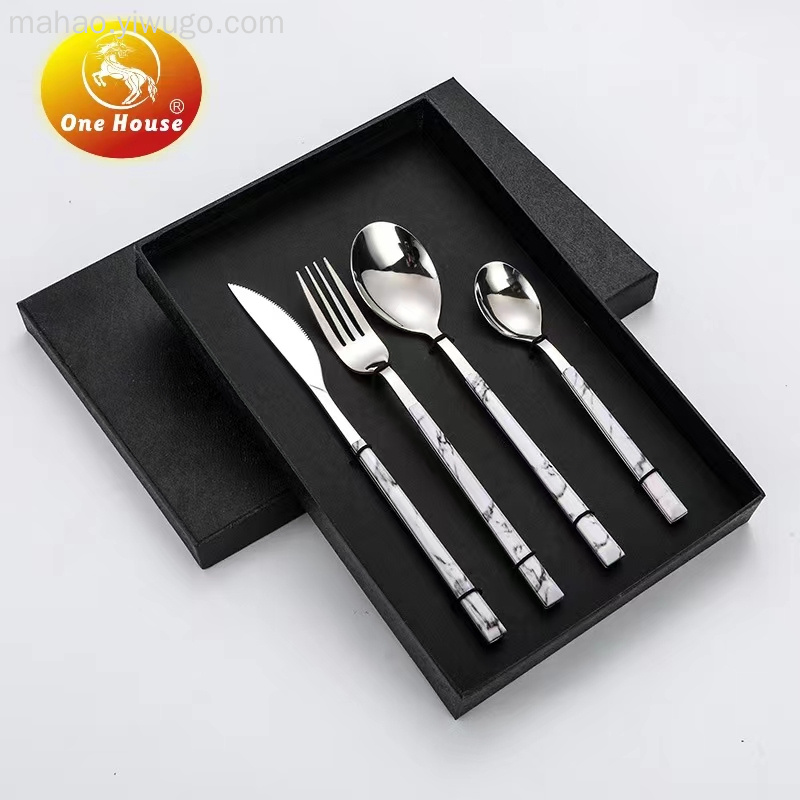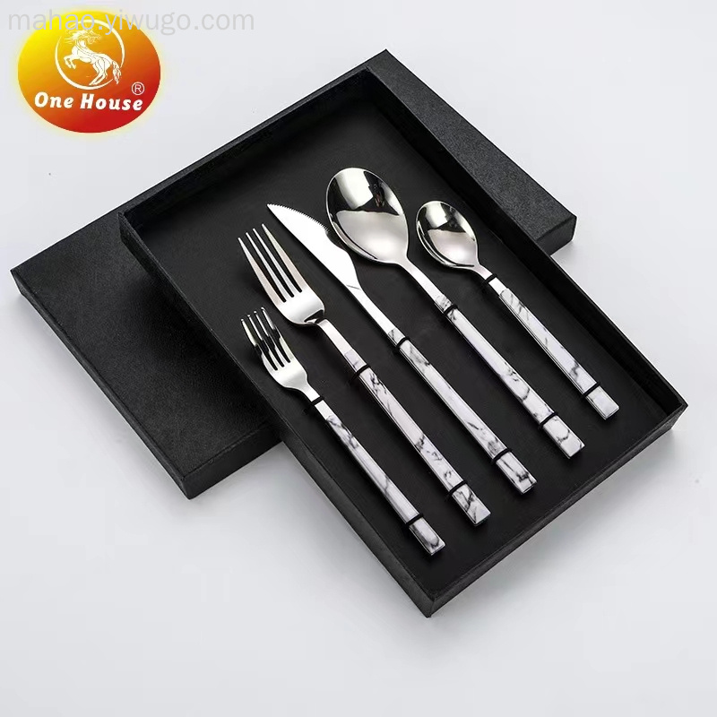 仿木夹柄/黑白色大理石夹柄/不锈钢柄刀叉勺黑盒装餐具系列