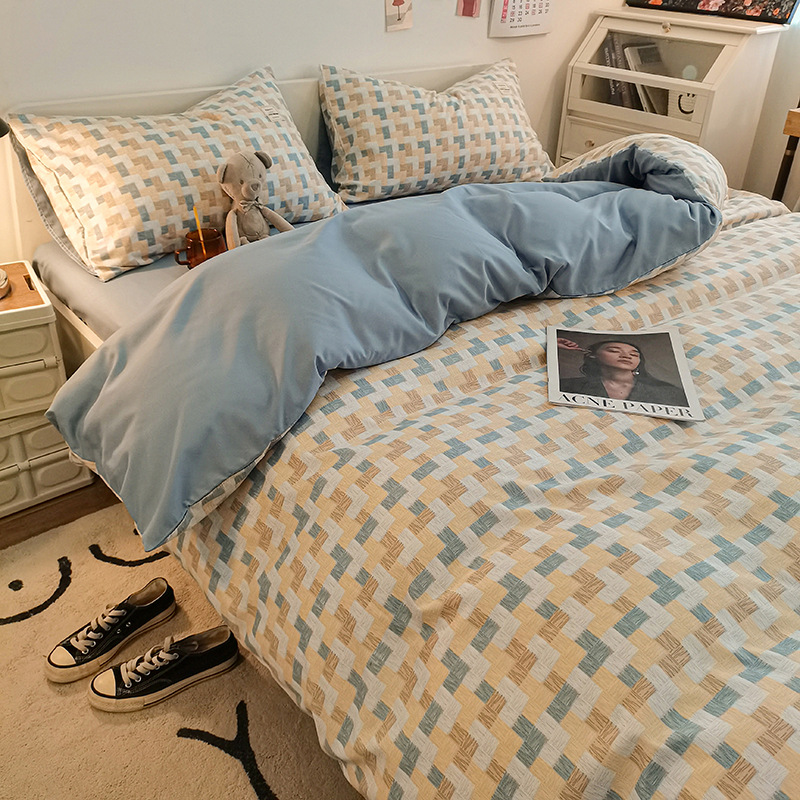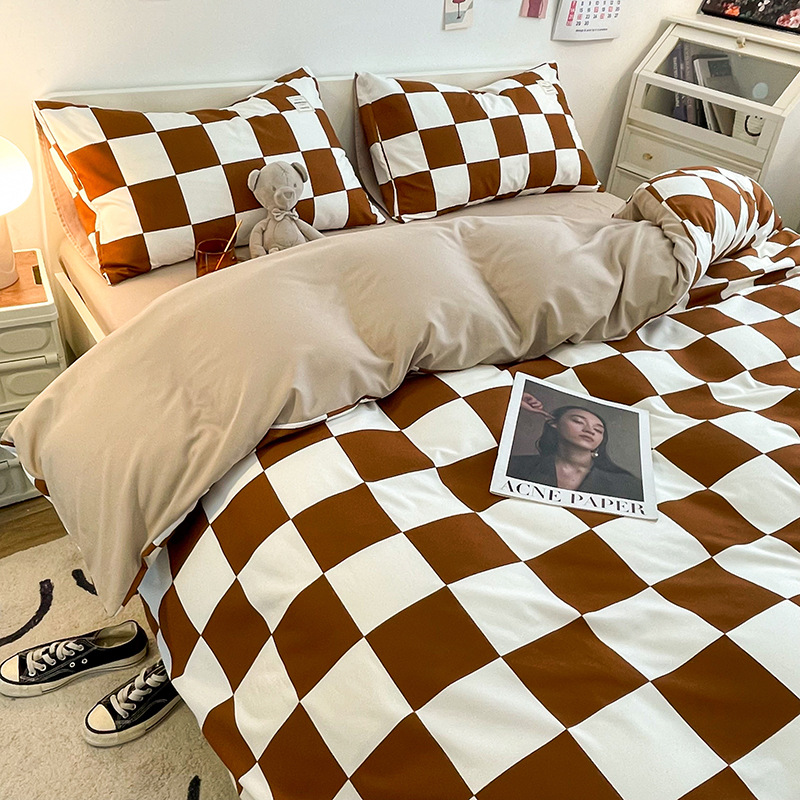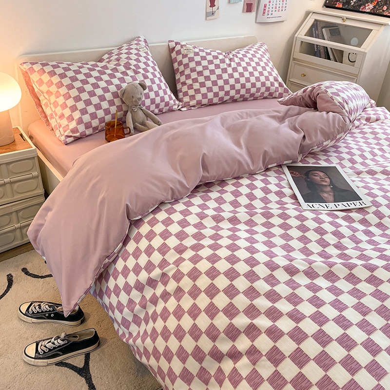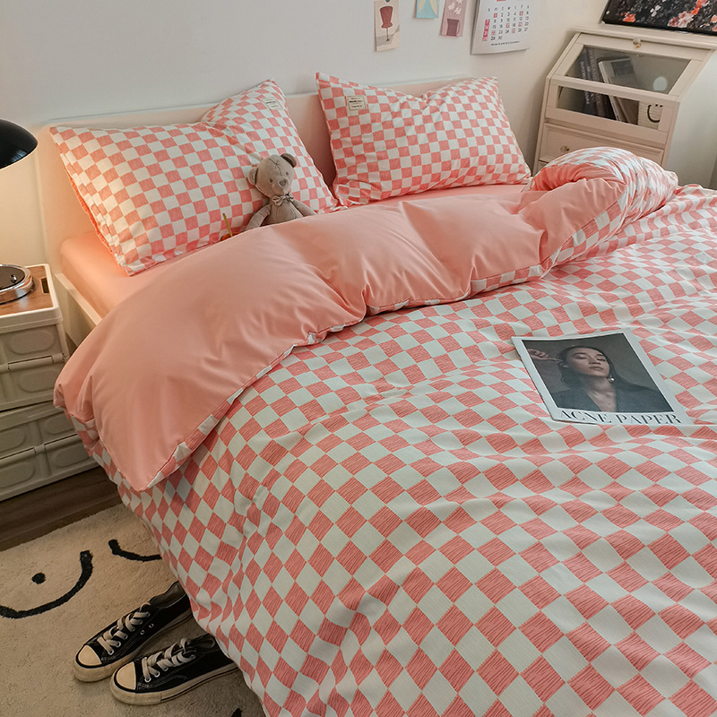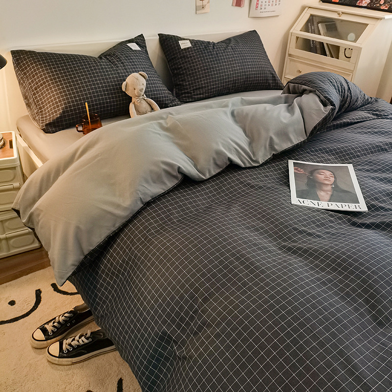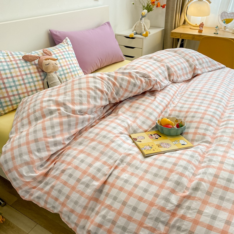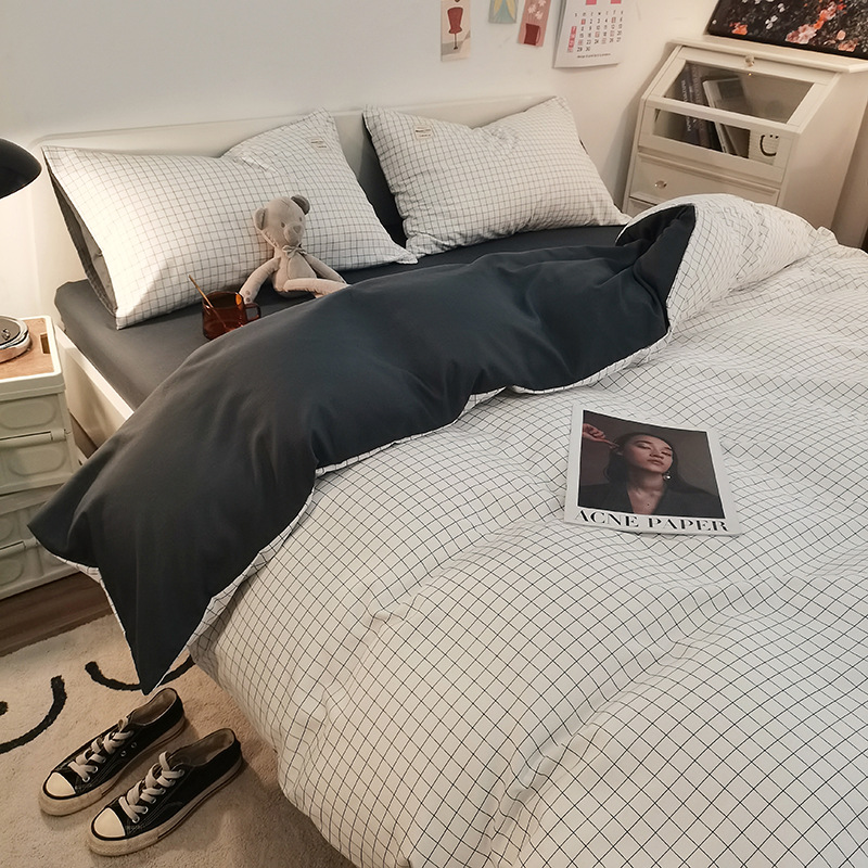 日式简约格子is水洗棉四件套亲肤纯色纯棉四件套床笠款床上用品