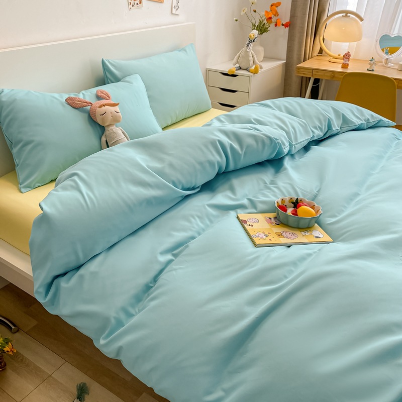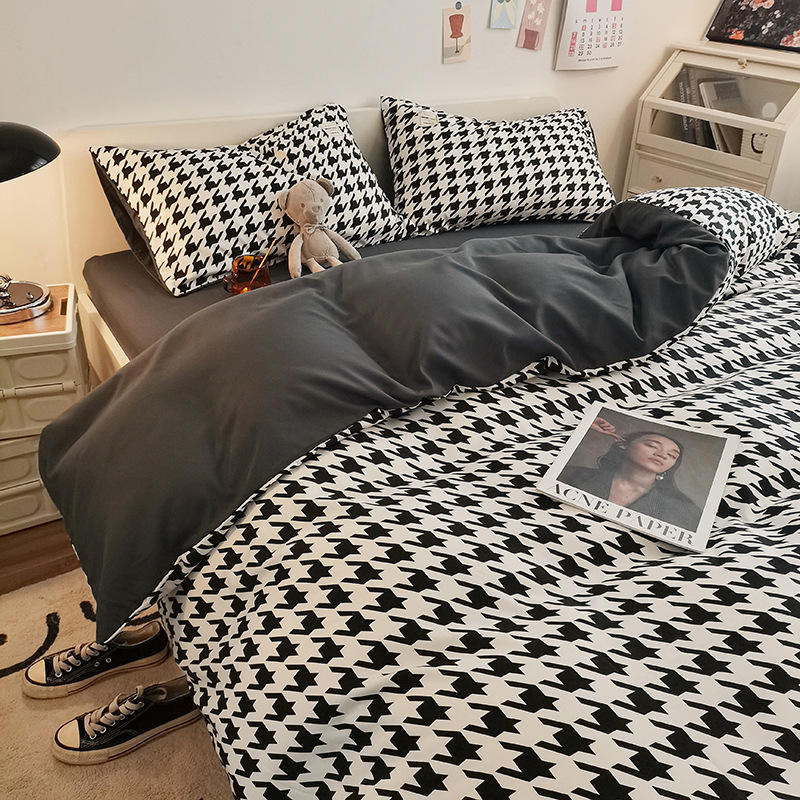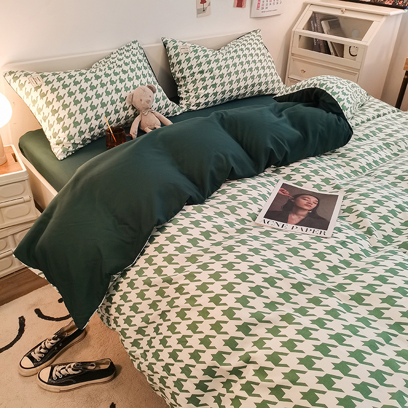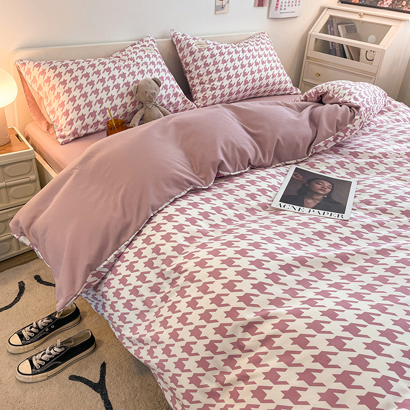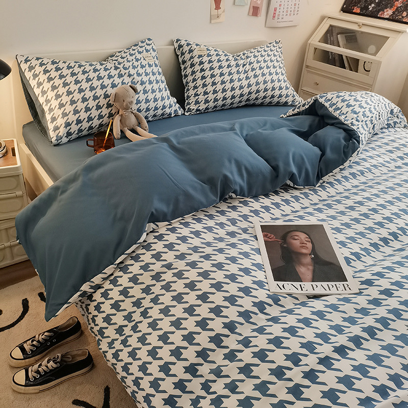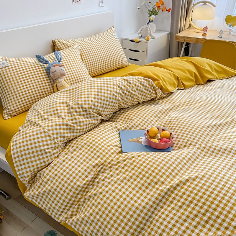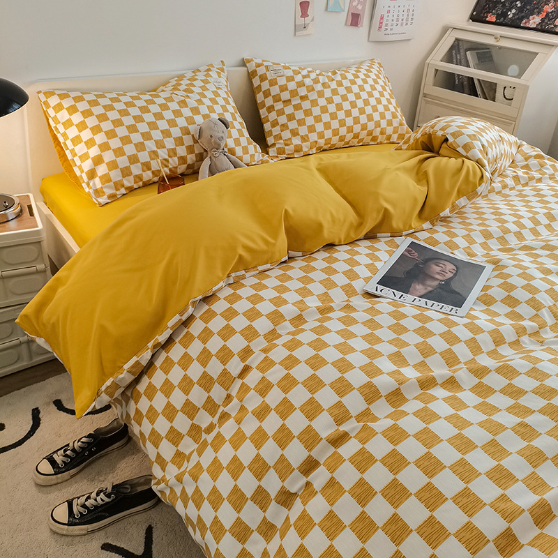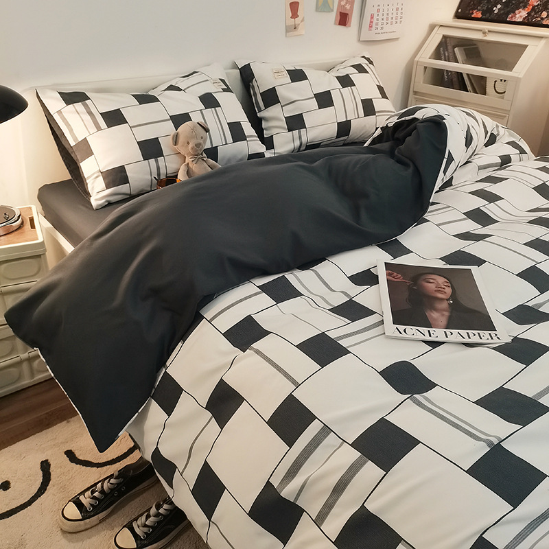 日式简约格子is水洗棉四件套亲肤纯色纯棉四件套床笠款床上用品