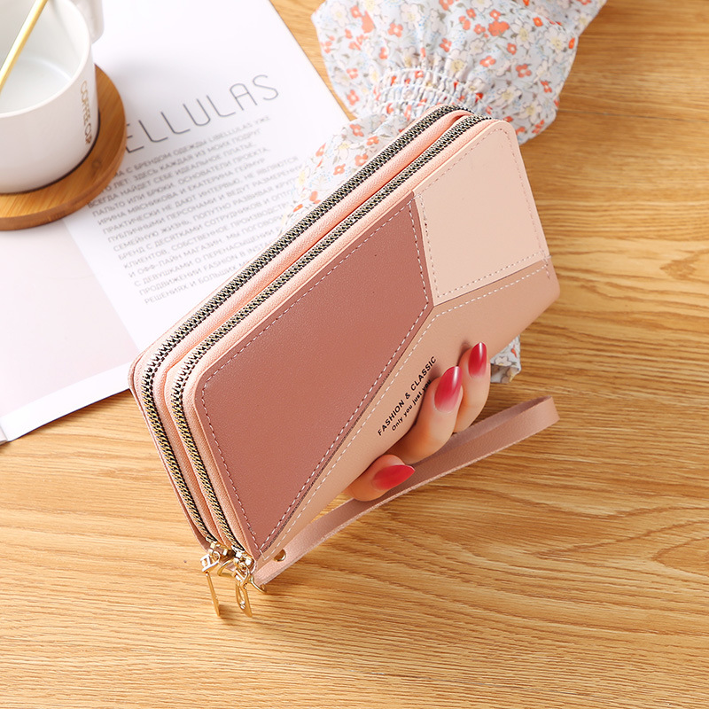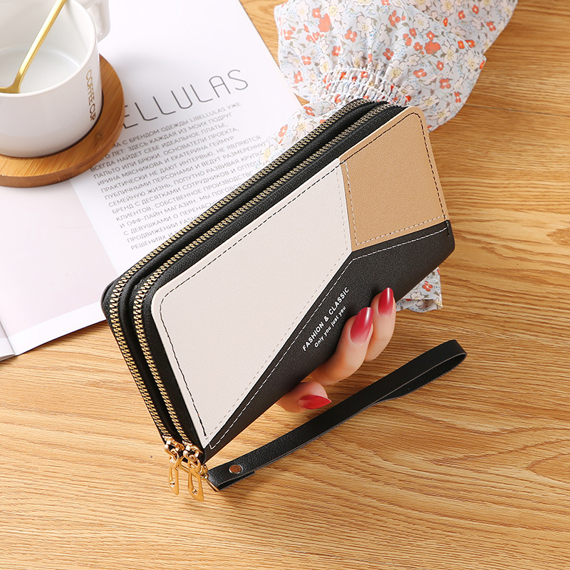 双拉链钱包女士长款大容量手拿包双层钱夹韩版拼接撞色零钱手机包
