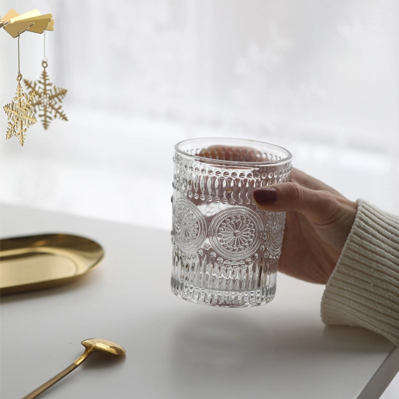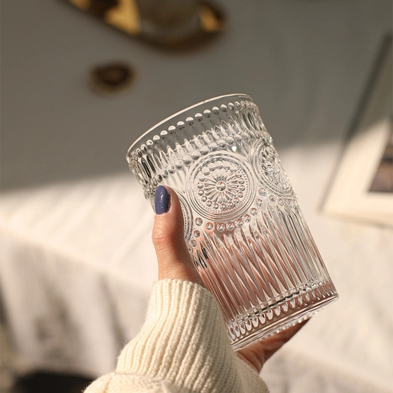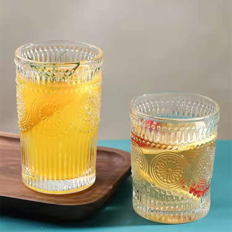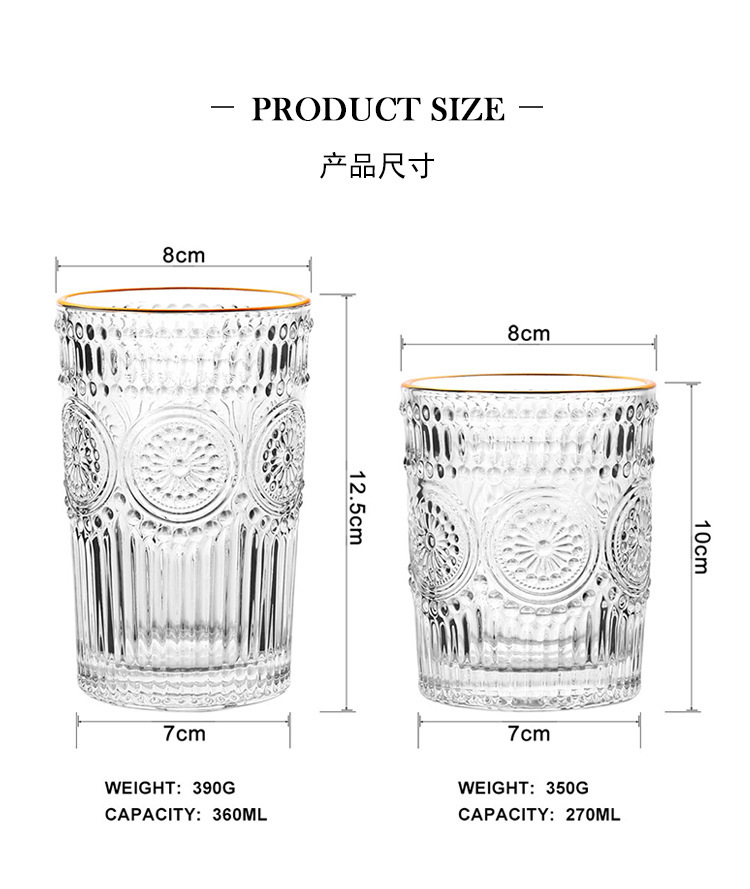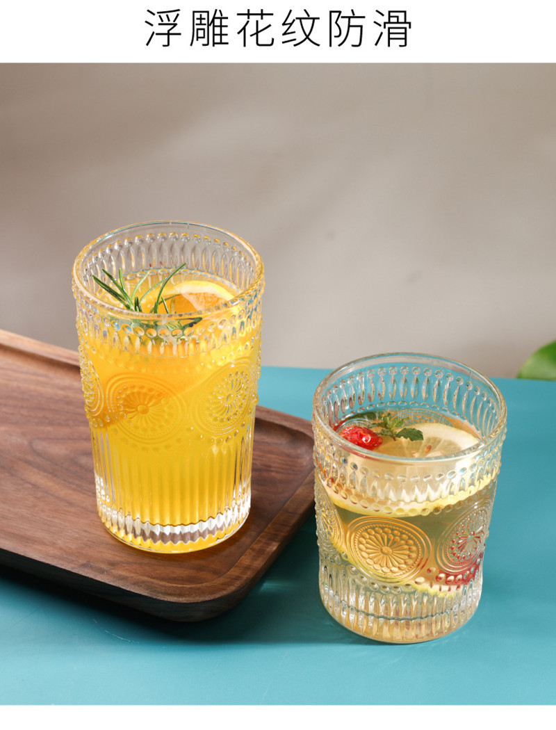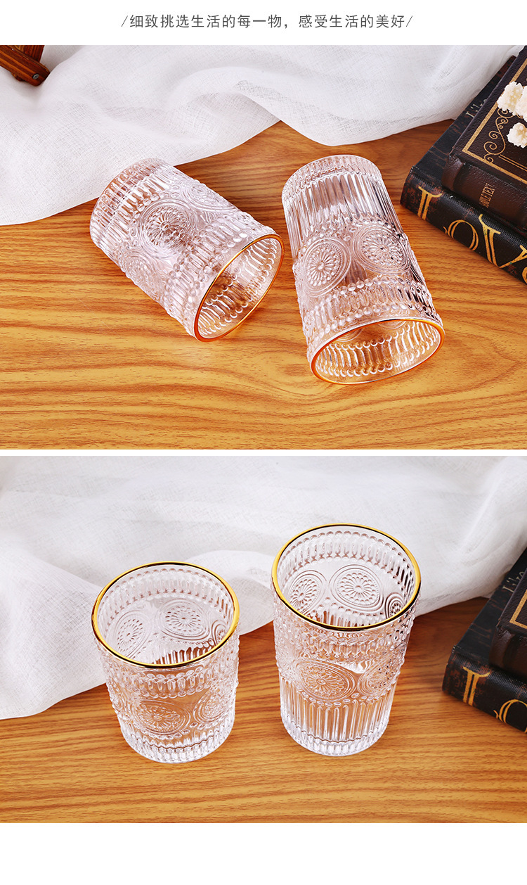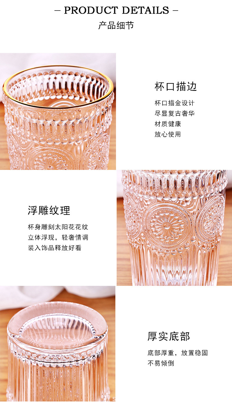 ins风太阳花玻璃杯 复古浮雕玻璃杯咖啡杯 网红金边家用冷饮杯