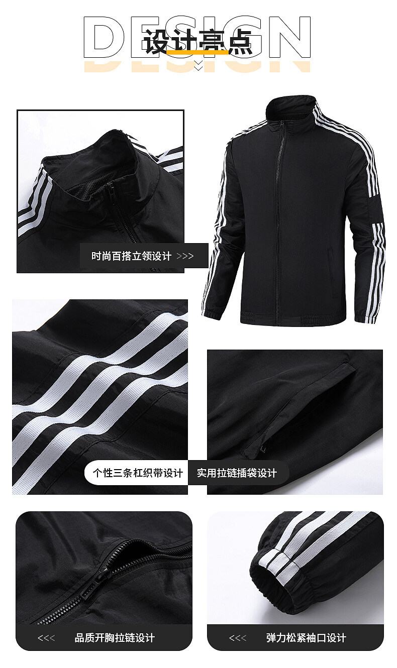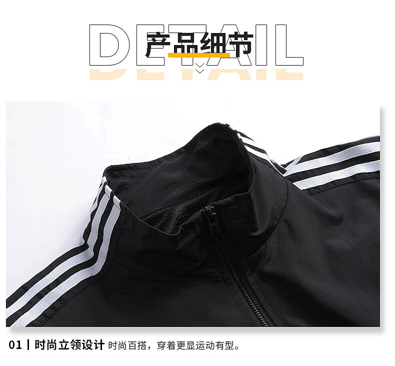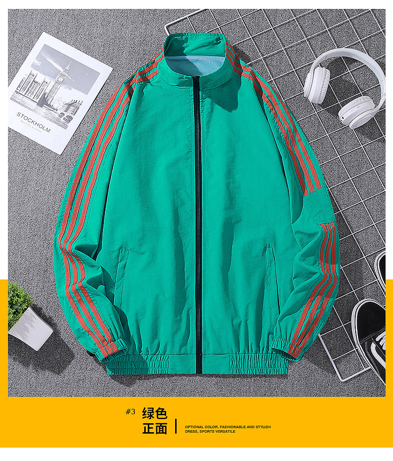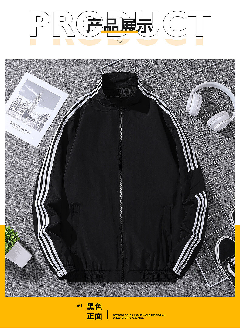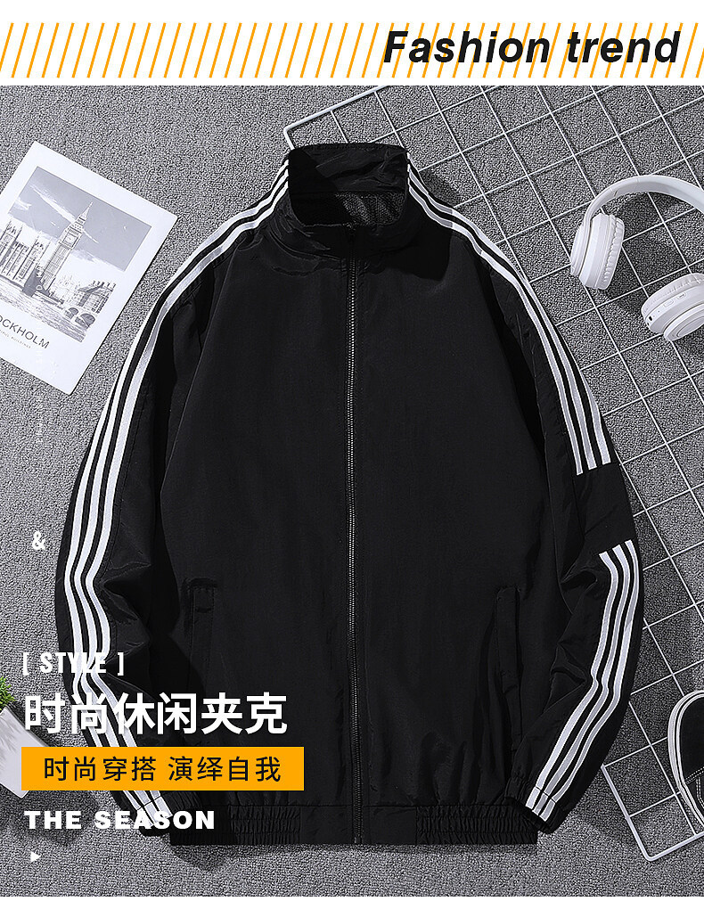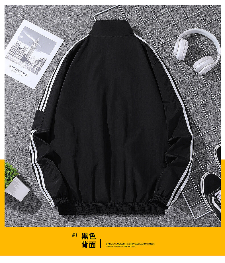 夹克男士运动休闲宽松春秋新款三条杠纯色立领户外跑步时尚外套