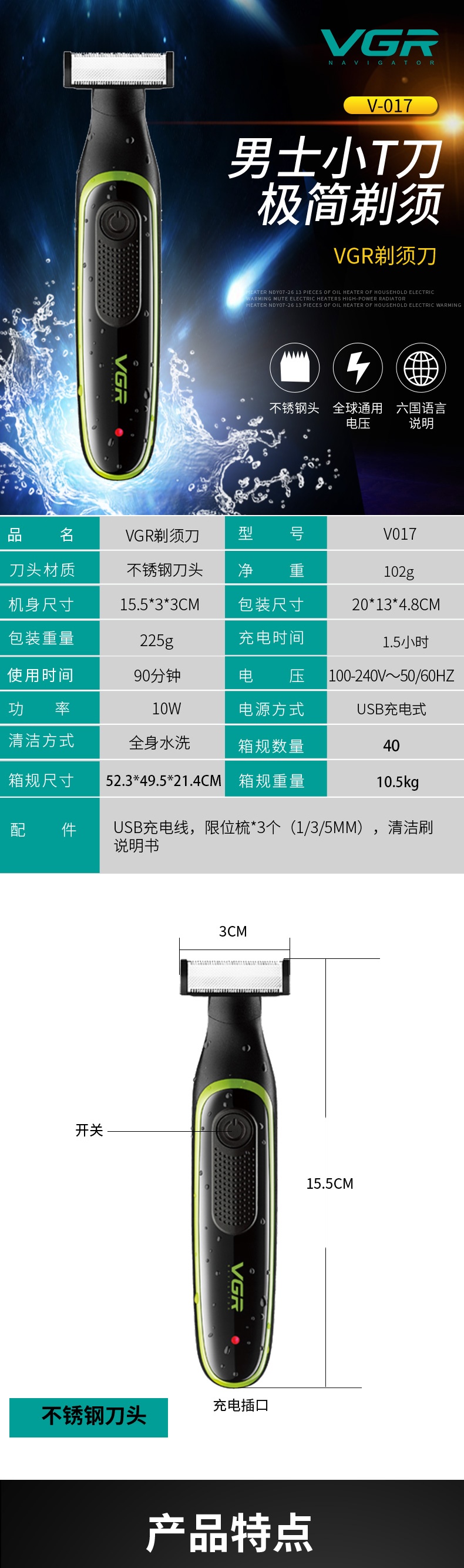 电动剃须刀VGR017小T刀刀头可水洗刮胡刀 USB充电男士剃须刀